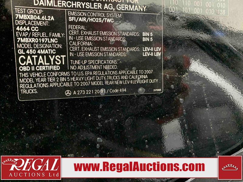 This 2007 MERCEDES-BENZ GL-450 4D UTILITY AWD is powered by a 4.7L 8 cylinder gasoline engine and an automatic transmission. It is equipped with four wheel drive. The SUV has seats for 7 people. The SUV has low mileage for its age. The vehicle has high value options including a sunroof, leather upholstery, power seats, heated seats, a DVD Player, a backup camera, and a power lift gate. The body looks to be in good condition overall. There are noteworthy scratches on the rear bumper. There is some paint peeling on the rear bumper. There are incidental chips on the front bumper. There is dent damage on the right rear fender. There are scratches on the right rear fender. There is minor rust on the right rear fender. There are very minor chips in some areas around the body. There are very minor scratches in many areas around the body. The interior looks to be in good condition overall. The windshield looks to be in good condition. All of the tires have lots of tread remaining. This SUV is being sold by an automotive broker. The vehicle will be sold with the following declarations: Claims Total $10,000 - $14,999 (See Footnote 1) and Out of Province - BC (See Footnote 2). Footnotes: 1) The vehicle's total recorded insurance claims history is between $10,000 - $14,999. This is the amount of money that was paid out by an insurance company for repairs to cover claims against the vehicle's insurance policy. This information is provided by CarFax. 2) The vehicle's last registered jurisdiction is British Columbia. The purchaser must have the vehicle undergo and pass an Out of Province inspection before it can be registered in Alberta. Regal Auctions Ltd. makes no guarantee or warranty, either express or implied, with respect to the data provided in this report. The information has been provided from the consignor and from sources generally believed to be reliable, however the accuracy of this information cannot be guaranteed by Regal Auctions.