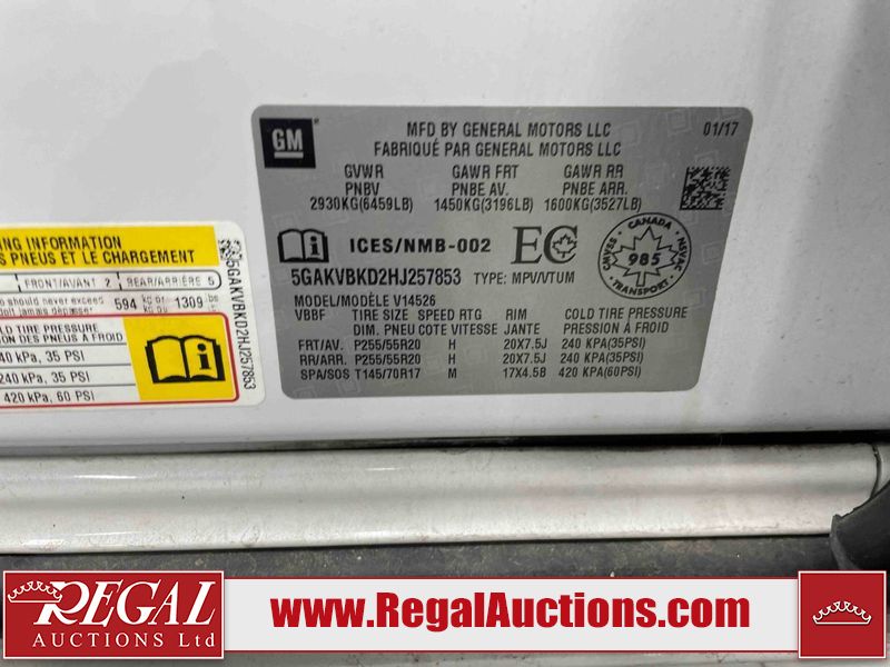 This 2017 BUICK ENCLAVE 4D UTILITY is powered by a 3.6L V6 gasoline engine and an automatic transmission. It is equipped with all-wheel drive. The SUV has seats for 7 people. The SUV has high mileage for its age. The vehicle has high-value options, including a sunroof, leather upholstery, power seats, heated seats, navigation, and a backup camera. The Battery, Airbag, ABS, Oil Pressure, Tire Pressure, Traction Control, and Brake lights are on. The body looks to be in good condition overall. There is slight dent damage on the rear door. There are very minor chips in many areas around the body. There are very minor scratches in many areas around the body. The interior looks to be in good condition overall. The dashboard, driver's seat, passenger seat, rear seats, and doors are dirty. The carpet is dirty. The windshield is chipped. All of the tires have lots of tread remaining. This SUV is being sold by an automotive broker. The vehicle will be sold with the following declarations: Claims Total $3000 - $4999 (See Footnote 1). Footnotes: 1) The vehicle's total recorded insurance claims history is between $3,000 - $4,999. This is the amount of money that was paid out by an insurance company for repairs to cover claims against the vehicle's insurance policy. This information is provided by CarFax. Regal Auctions Ltd. makes no guarantee or warranty, either express or implied, with respect to the data provided in this report. The information has been provided from the consignor and from sources generally believed to be reliable, however the accuracy of this information cannot be guaranteed by Regal Auctions.