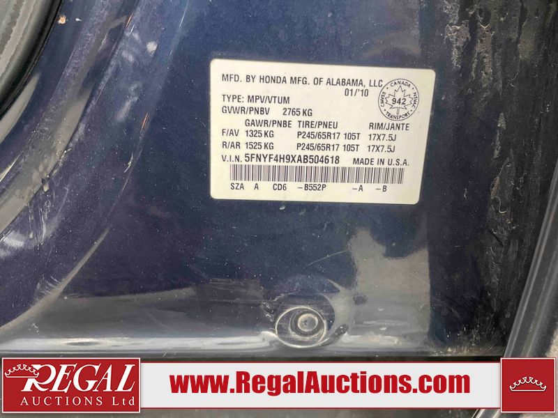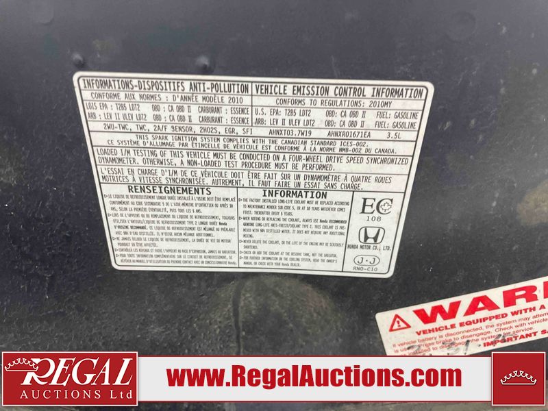 This 2010 HONDA PILOT TOURING 4D UTILITY 4WD is powered by a 3.5L V6 gasoline engine and an automatic transmission. It is equipped with four-wheel drive. The SUV has seats for 8 people. The SUV has high mileage for its age. The vehicle has high-value options including a sunroof, leather upholstery, power seats, heated seats, a DVD Player, navigation, a backup camera, and a power lift gate. The Check Engine and Tire Pressure lights are on. The vehicle has some mechanical problems. *EXHAUST LEAK* (See Footnote 1) The body looks to be in rough condition overall. There is considerable rust on the left rear fender and rear door. There are chips on the front bumper, hood, roof, left front fender, left front door, left rear door, rear bumper, rear door, right rear fender, right rear door, and right front door. There are scratches on the front bumper, left front door, left rear door, left rear fender, rear bumper, rear door, right rear fender, right rear door, and right front door. There is incidental rust on the left rear door. There is dent damage on the right rear fender. There are very minor chips in a few areas around the body. There are very minor scratches in a few areas around the body. There is very minor dent damage in a few areas around the body. The headlight lenses are hazy. The fog lights are cracked. The interior looks to be in good condition overall. The driver seat is worn. The windshield is cracked. All of the tires have lots of tread remaining. This SUV is being sold by an automotive broker. The vehicle will be sold with the following declarations: Mechanical Problems (See Footnote 1). Footnotes: 1) We've identified some mechanical problems with the vehicle. However, the vehicle has not undergone a mechanical inspection and our findings are not to be considered a complete evaluation of the vehicle's mechanical condition. Review our Buyer Protection Policy to see how Regal Auctions protects you from undisclosed mechanical problems. Regal Auctions Ltd. makes no guarantee or warranty, either express or implied, with respect to the data provided in this report. The information has been provided from the consignor and from sources generally believed to be reliable, however the accuracy of this information cannot be guaranteed by Regal Auctions.