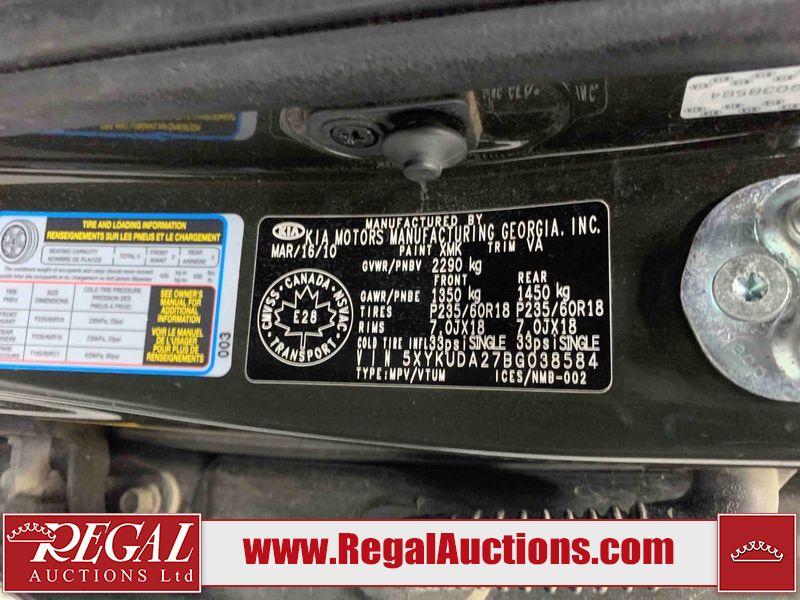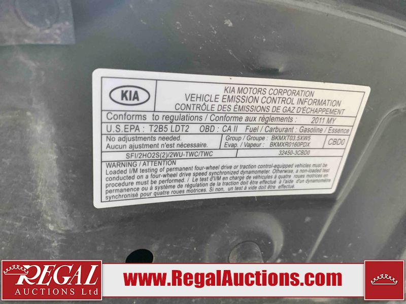 This 2011 KIA SORENTO 4D UTILITY AWD is powered by a 3.5L V6 gasoline engine and an automatic transmission. It is equipped with all-wheel drive. The SUV has seats for 5 people. The SUV has low mileage for its age. The vehicle has high-value options, including a sunroof, leather upholstery, power seats, heated seats, navigation, and a power lift gate. The body looks to be in fair condition overall. There is minor dent damage on the hood, right rear fender, right rear door, and right front door. There is rust on the rear door. There are incidental scratches on the right rear door and right front door. There are very minor chips in many areas around the body. There are very minor scratches in many areas around the body. The headlight lenses are hazy. The front bumper is misaligned. The interior looks to be in fair condition overall. The passenger seat is stained. The dashboard, driver's seat, passenger seat, rear seats, and doors are dirty. The carpet is dirty. The windshield is chipped. The tires are all worn. This SUV is being sold by an automotive broker. The vehicle will be sold with the following declarations: Out of Province - SK (See Footnote 1). Footnotes: 1) The vehicle's last registered jurisdiction is Saskatchewan. The purchaser must have the vehicle undergo and pass an Out of Province inspection before it can be registered in Alberta. Regal Auctions Ltd. makes no guarantee or warranty, either express or implied, with respect to the data provided in this report. The information has been provided from the consignor and from sources generally believed to be reliable, however the accuracy of this information cannot be guaranteed by Regal Auctions.