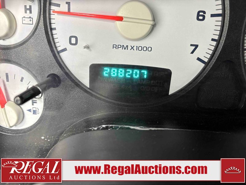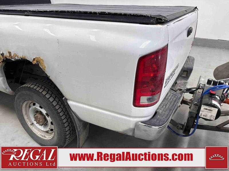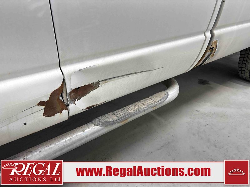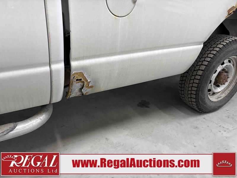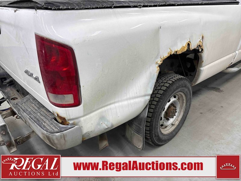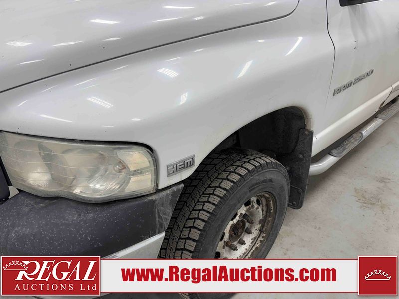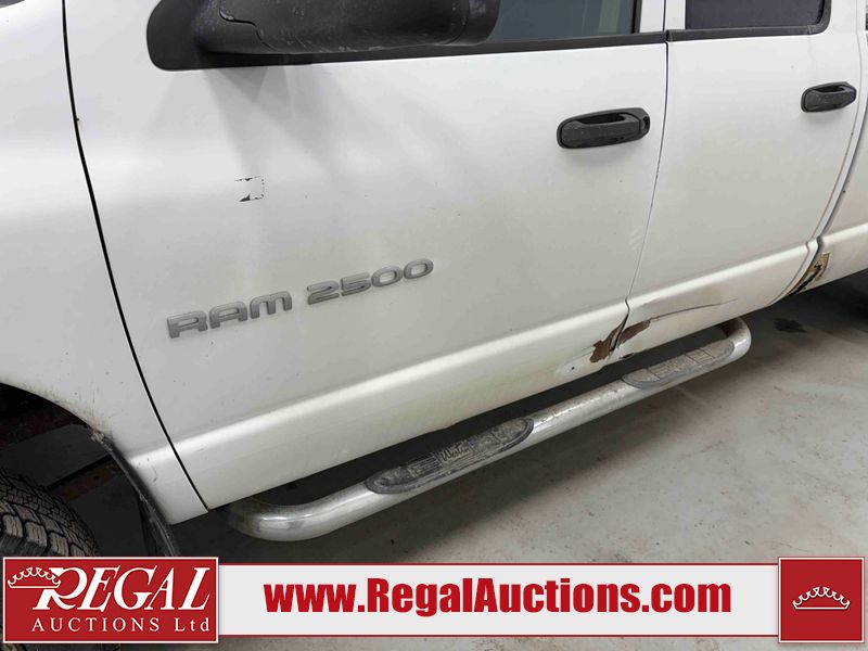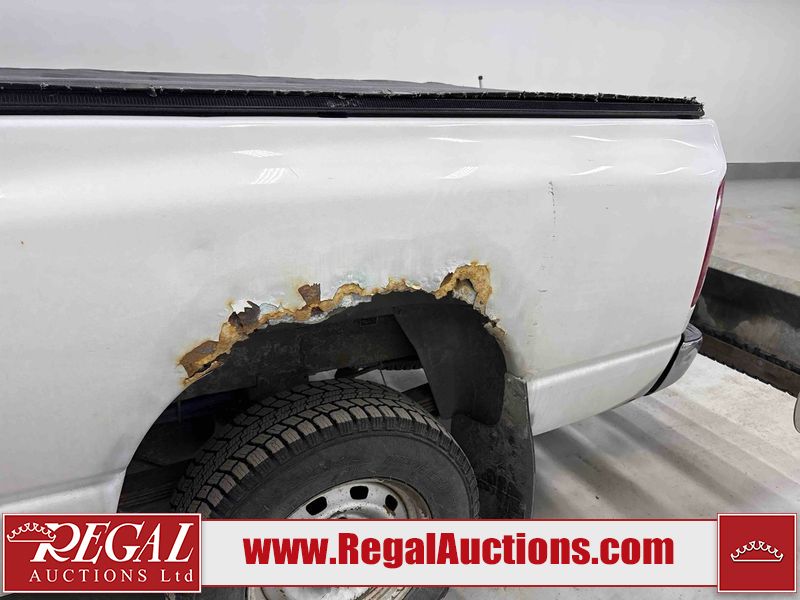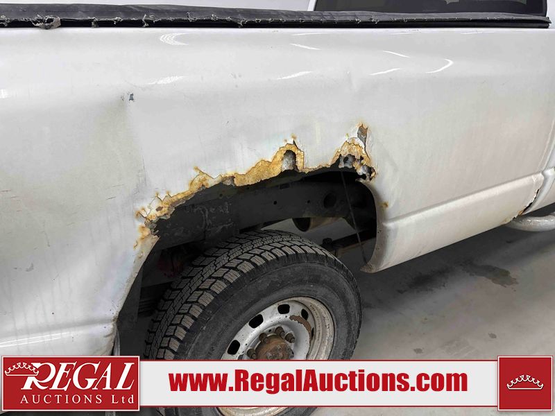 This 2003 DODGE RAM 2500 QUAD CAB 4WD is powered by a 5.7L V8 gasoline engine and an automatic transmission. It is equipped with four-wheel drive. The truck has seats for 6 people. The truck has high mileage for its age. The vehicle does not have power windows or power locks. The Check Engine light is on. The body looks to be in rough condition overall. There is considerable rust on the left front door, left rear fender, tailgate, and right rear fender. The left rear fender and right rear fender have been repainted poorly. There is very bad dent damage on the right rear fender. There are some scratches on the left rear door. There is moderate rust on the left rear door. The left rear door is broken. There is slight rust on the front bumper, hood, roof, right rear door, right front door, and right front fender. The front bumper has parts missing. There are minimal scratches on the left front door and tailgate. There is incidental dent damage on the left front door, left rear door, rear bumper, tailgate, and right rear door. There are very minor chips in many areas around the body. There are very minor scratches in many areas around the body. There is very minor dent damage on the front bumper. The interior looks to be in good condition overall. The windshield is chipped. All of the tires have lots of tread remaining. This truck is being sold by a private individual. Regal Auctions Ltd. makes no guarantee or warranty, either express or implied, with respect to the data provided in this report. The information has been provided from the consignor and from sources generally believed to be reliable, however the accuracy of this information cannot be guaranteed by Regal Auctions.
