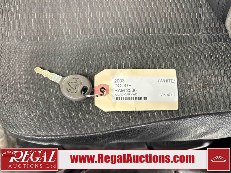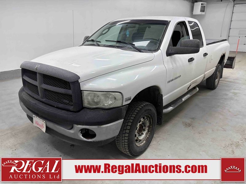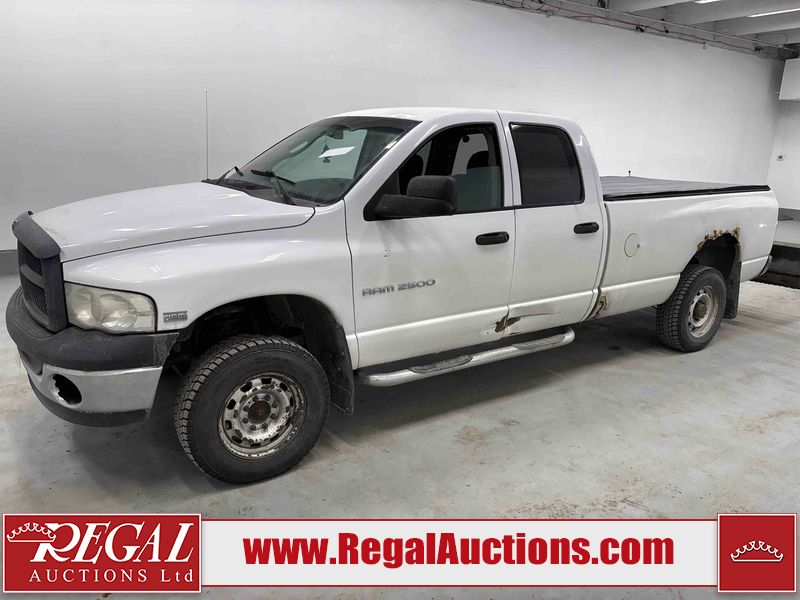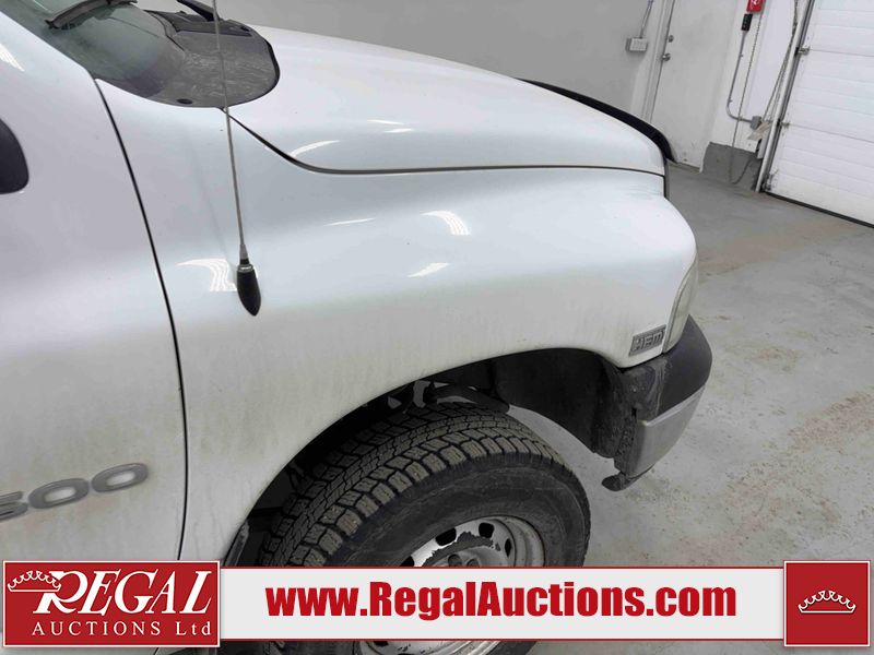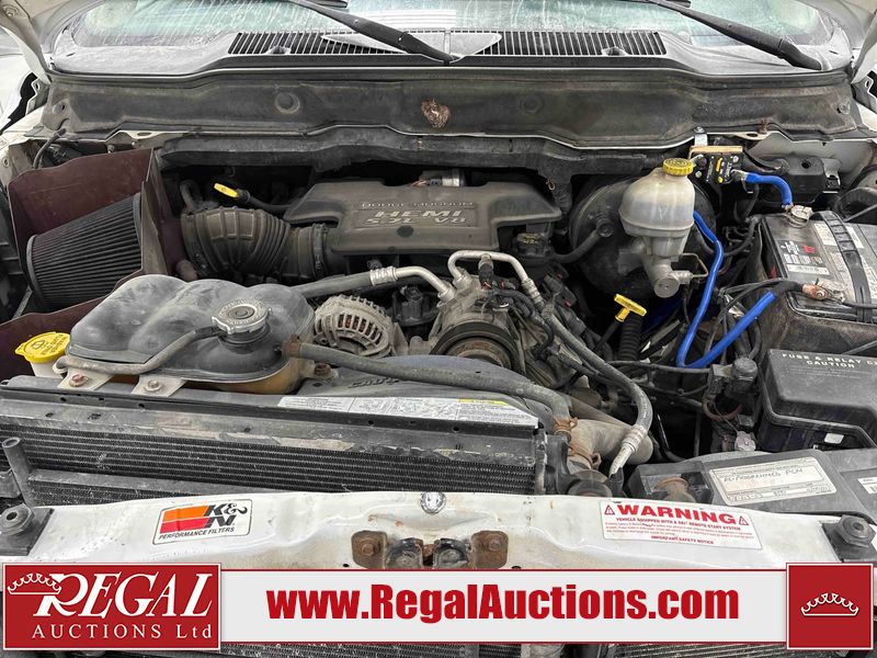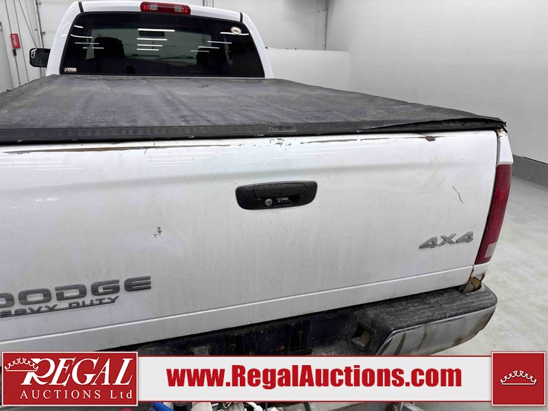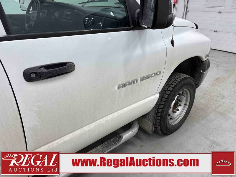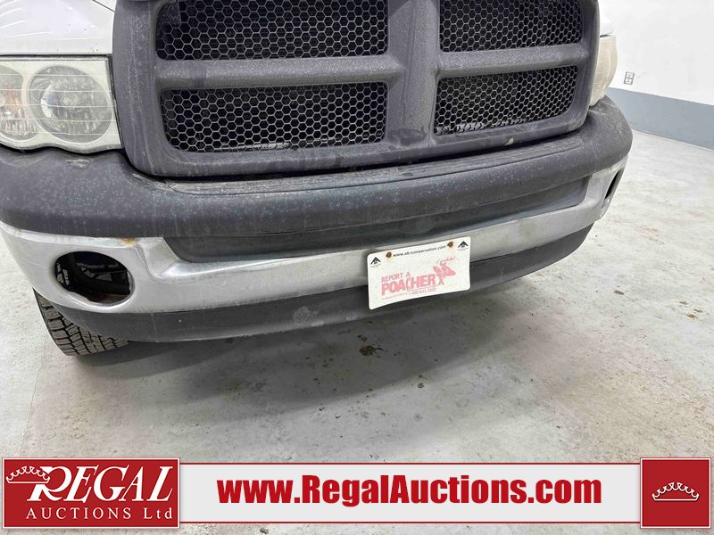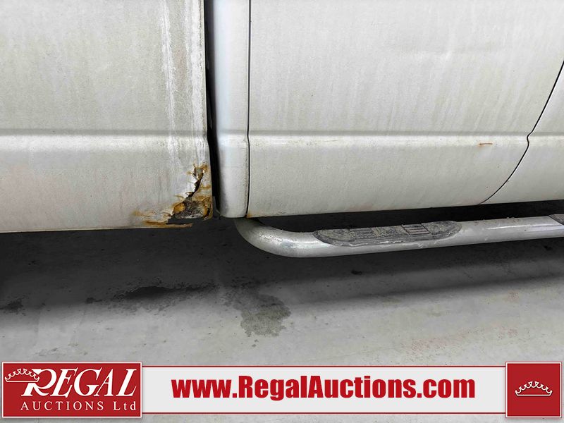 This 2003 DODGE RAM 2500 QUAD CAB 4WD is powered by a 5.7L V8 gasoline engine and an automatic transmission. It is equipped with four-wheel drive. The truck has seats for 6 people. The truck has high mileage for its age. The vehicle does not have power windows or power locks. The Check Engine light is on. The body looks to be in rough condition overall. There is considerable rust on the left front door, left rear fender, tailgate, and right rear fender. The left rear fender and right rear fender have been repainted poorly. There is very bad dent damage on the right rear fender. There are some scratches on the left rear door. There is moderate rust on the left rear door. The left rear door is broken. There is slight rust on the front bumper, hood, roof, right rear door, right front door, and right front fender. The front bumper has parts missing. There are minimal scratches on the left front door and tailgate. There is incidental dent damage on the left front door, left rear door, rear bumper, tailgate, and right rear door. There are very minor chips in many areas around the body. There are very minor scratches in many areas around the body. There is very minor dent damage on the front bumper. The interior looks to be in good condition overall. The windshield is chipped. All of the tires have lots of tread remaining. This truck is being sold by a private individual. Regal Auctions Ltd. makes no guarantee or warranty, either express or implied, with respect to the data provided in this report. The information has been provided from the consignor and from sources generally believed to be reliable, however the accuracy of this information cannot be guaranteed by Regal Auctions.