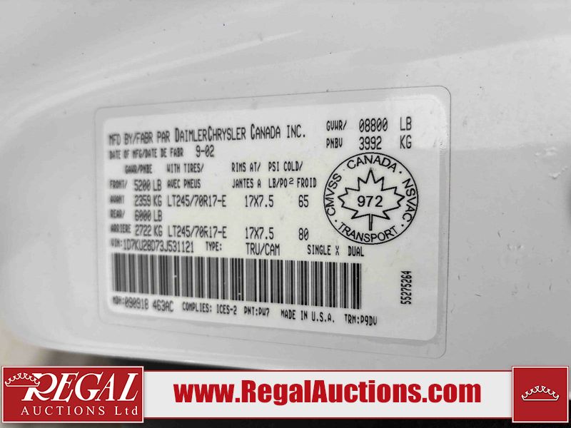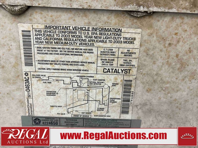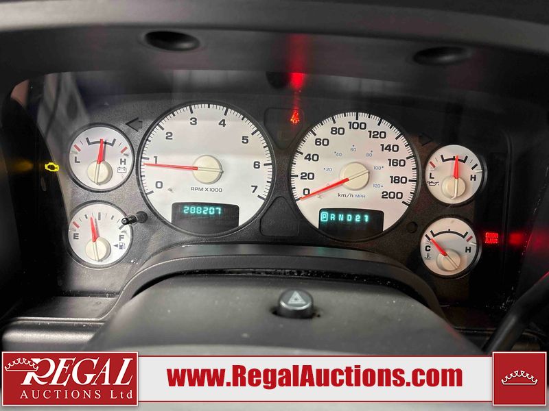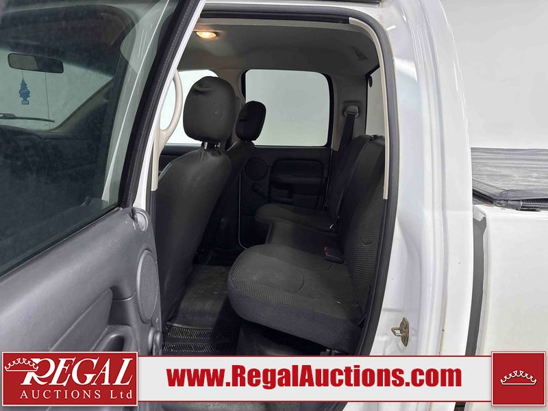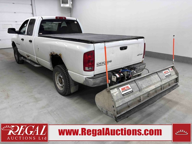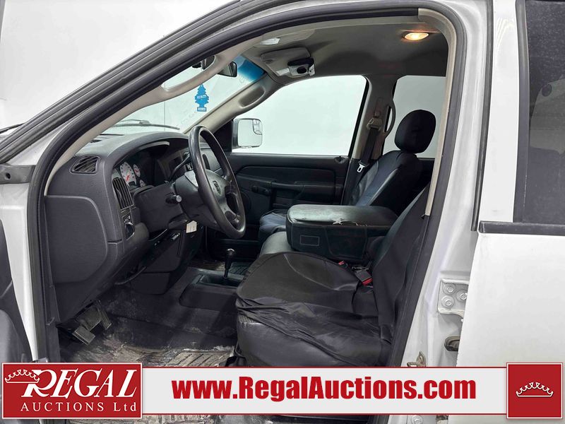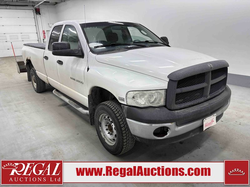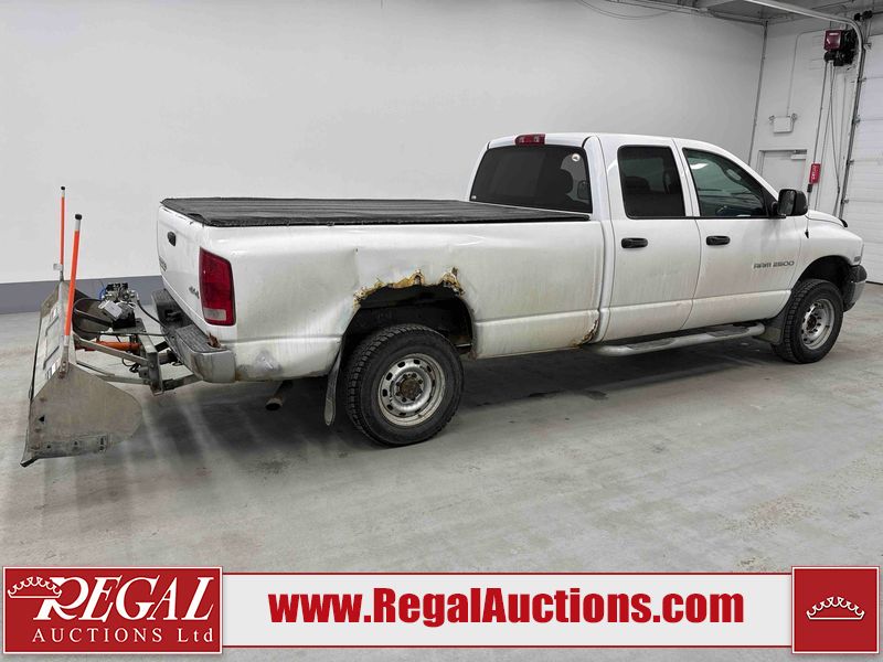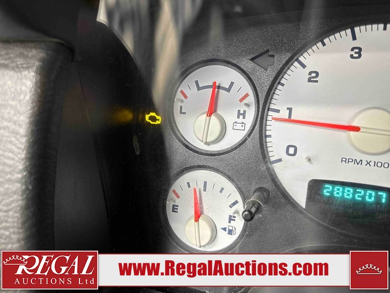 This 2003 DODGE RAM 2500 QUAD CAB 4WD is powered by a 5.7L V8 gasoline engine and an automatic transmission. It is equipped with four-wheel drive. The truck has seats for 6 people. The truck has high mileage for its age. The vehicle does not have power windows or power locks. The Check Engine light is on. The body looks to be in rough condition overall. There is considerable rust on the left front door, left rear fender, tailgate, and right rear fender. The left rear fender and right rear fender have been repainted poorly. There is very bad dent damage on the right rear fender. There are some scratches on the left rear door. There is moderate rust on the left rear door. The left rear door is broken. There is slight rust on the front bumper, hood, roof, right rear door, right front door, and right front fender. The front bumper has parts missing. There are minimal scratches on the left front door and tailgate. There is incidental dent damage on the left front door, left rear door, rear bumper, tailgate, and right rear door. There are very minor chips in many areas around the body. There are very minor scratches in many areas around the body. There is very minor dent damage on the front bumper. The interior looks to be in good condition overall. The windshield is chipped. All of the tires have lots of tread remaining. This truck is being sold by a private individual. Regal Auctions Ltd. makes no guarantee or warranty, either express or implied, with respect to the data provided in this report. The information has been provided from the consignor and from sources generally believed to be reliable, however the accuracy of this information cannot be guaranteed by Regal Auctions.