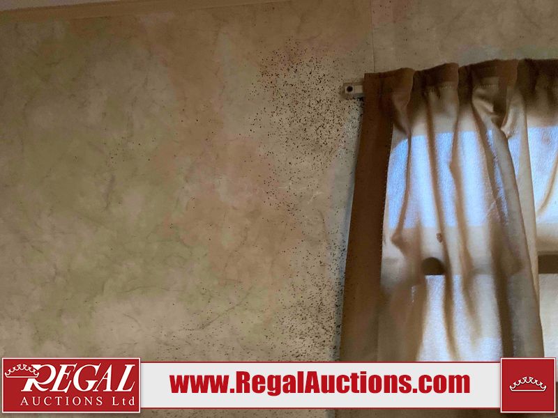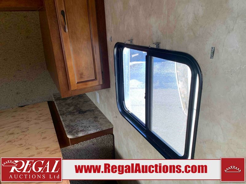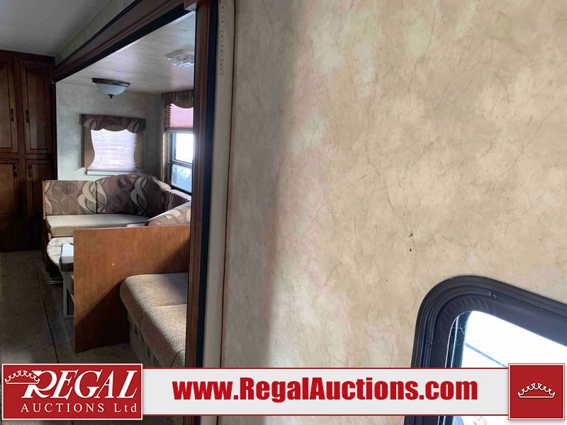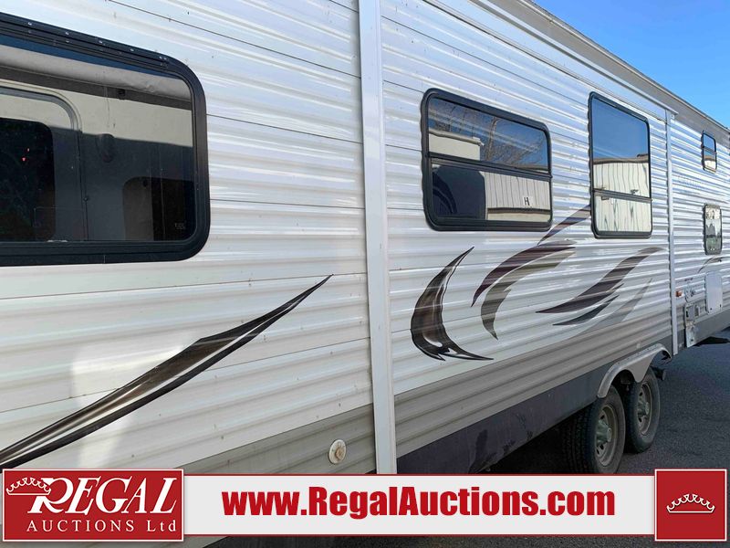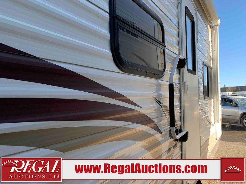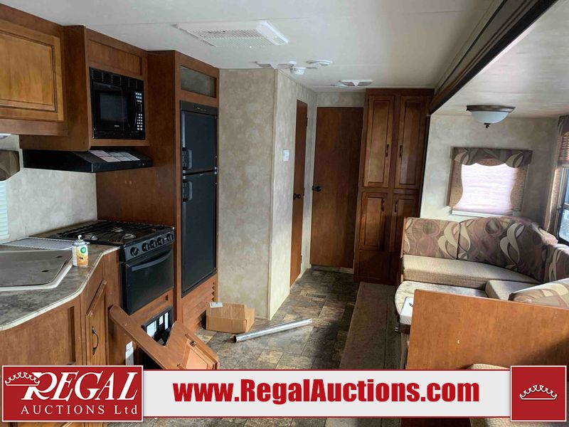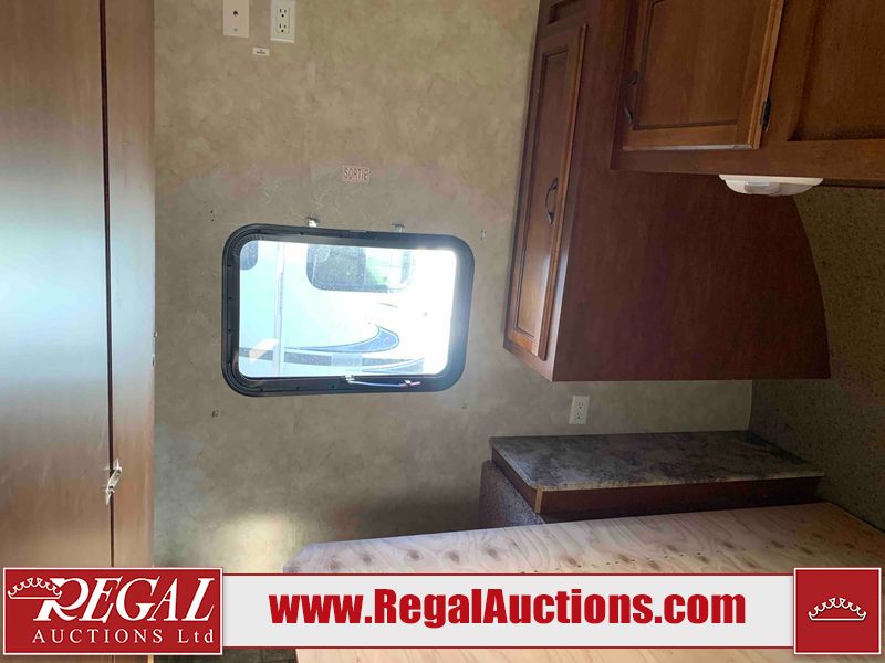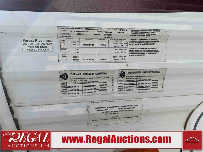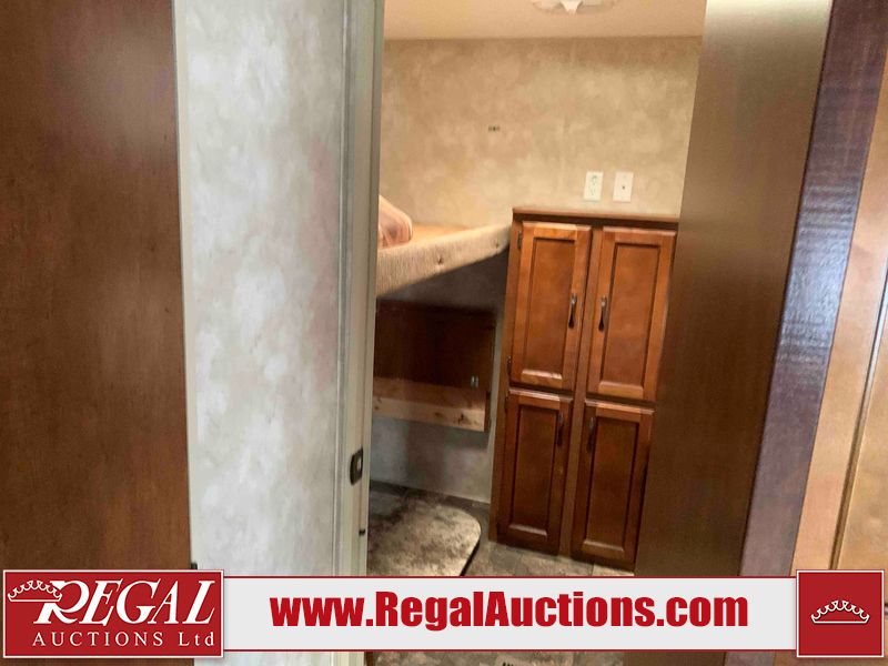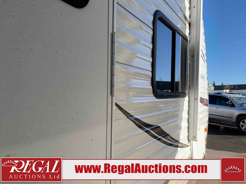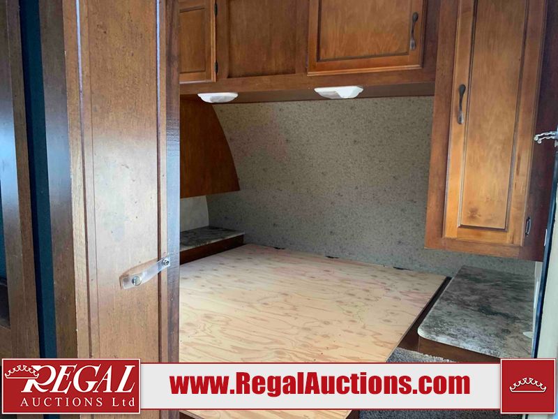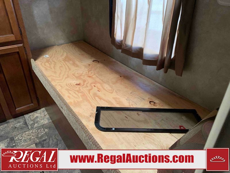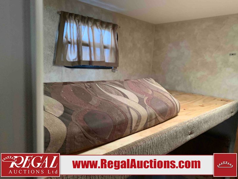 This RV is a 2013 Forest River Catalina 30BHS model tandem axle bumper trailer. It has a single door entry, roof air, single slide out accommodating the living area. The interior is dirty. The mattress is missing. Some walls are showing scratches and scuffs. The master bedroom window curtains are missing and detached. The floor is lifting. The television is missing. The carpet is stained. The couch is stained. The dinette table is removed and sitting in the kitchen area floor. All bunkhouse bed are missing, the bunkhouse walls are showing mildew. All rear sky windows trim is cracked. The refrigerator panels are showing signs of water damage. The exterior walls are made out of soft wall aluminum. The tires are mounted to alloy wheels and appear to be good enough condition to use. All walls are showing scuffs, scratches and chips. The front and left front wall are showing water delamination. Some decals are peeling. The rear wall is dented. The rear right wall lower trim is separating. The right wall has hail damage. This unit gets power with external power applied. The battery is missing. The tires are mounted to alloy rims and appear to be in good enough condition for use. The RV is equipped with a microwave, three burner stove top, oven, refrigerator, and a stereo system. The layout consist of the master bedroom in the front, kitchenette/dinette in the center, and washroom/bunkhouse at the rear.
