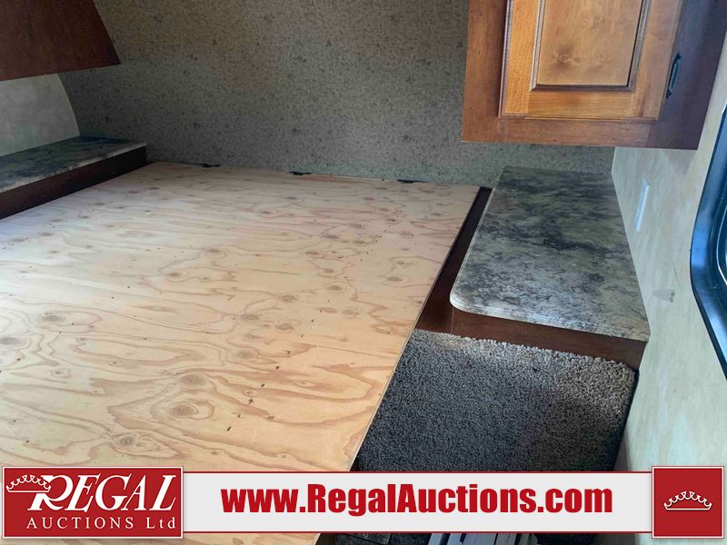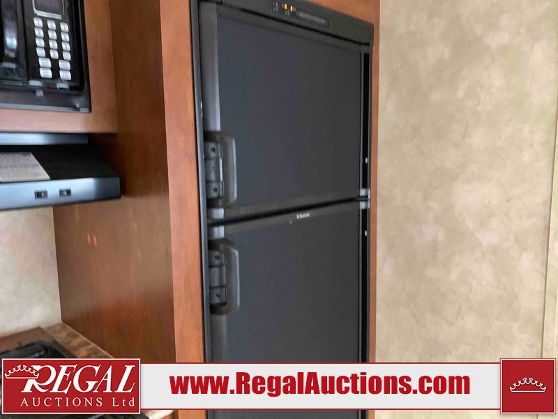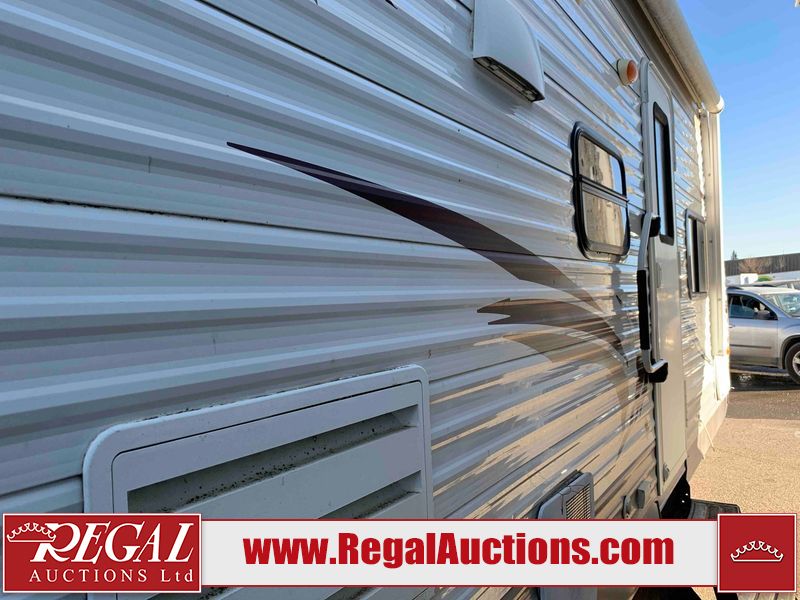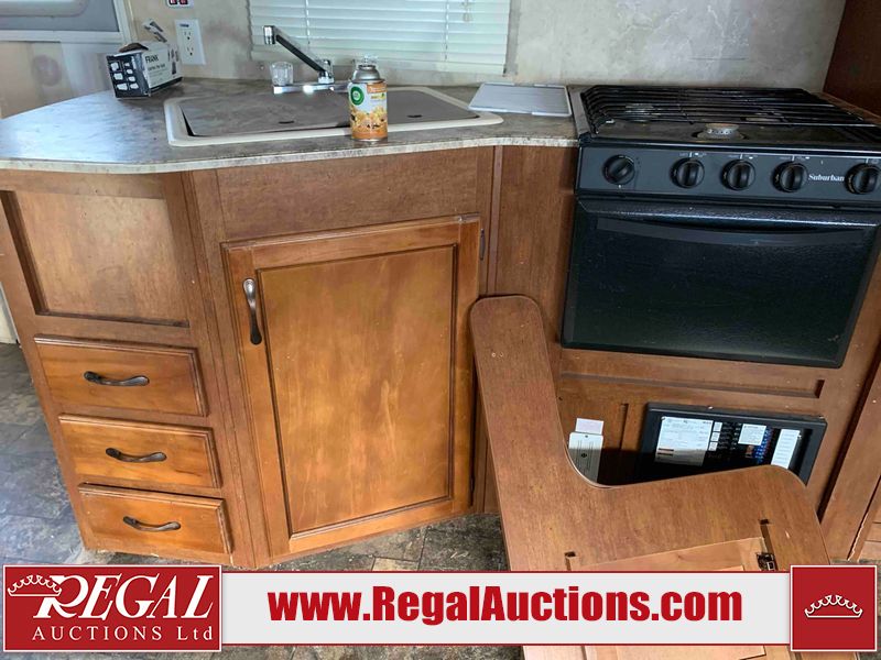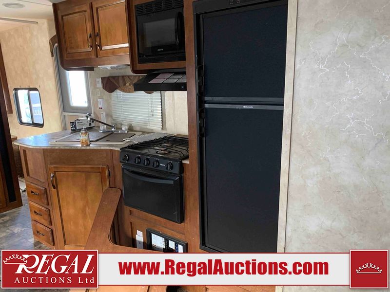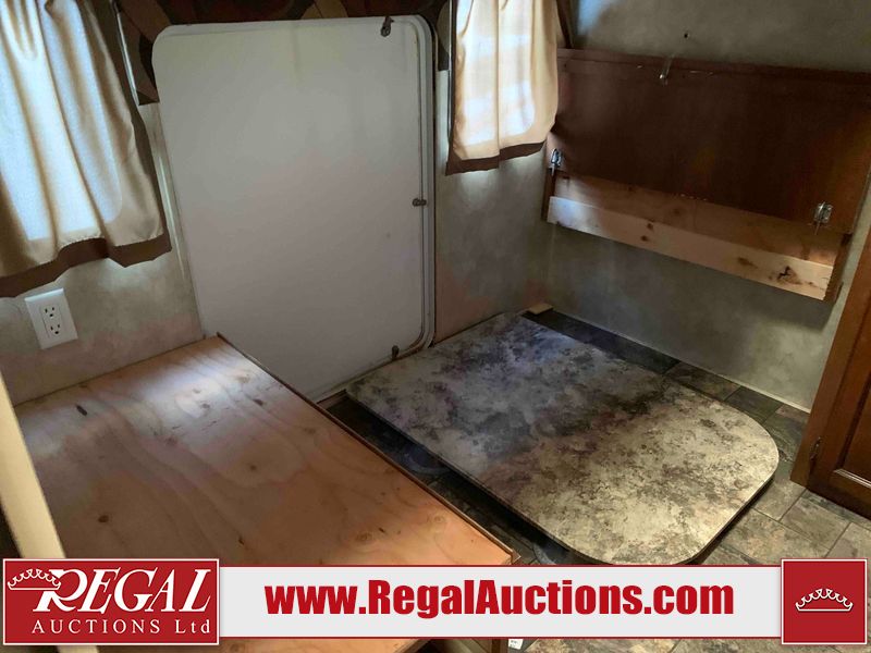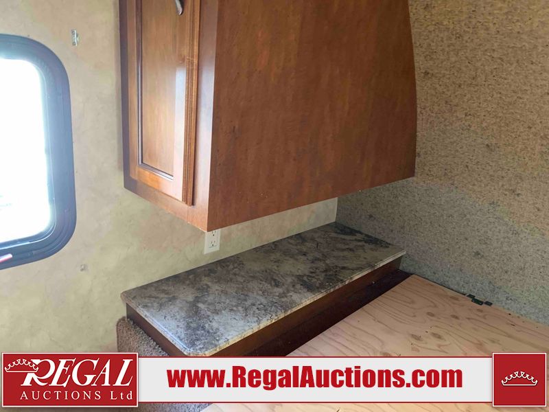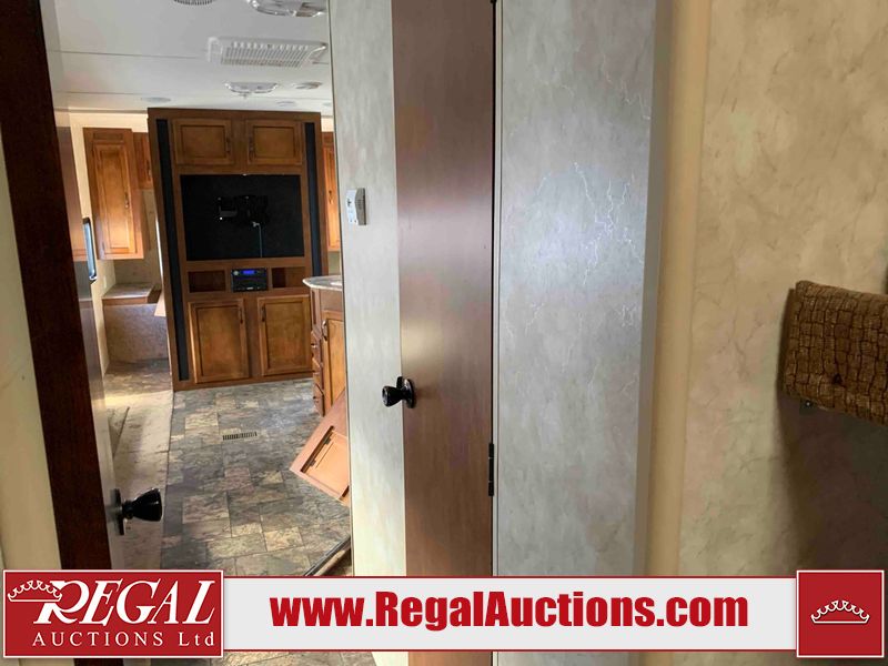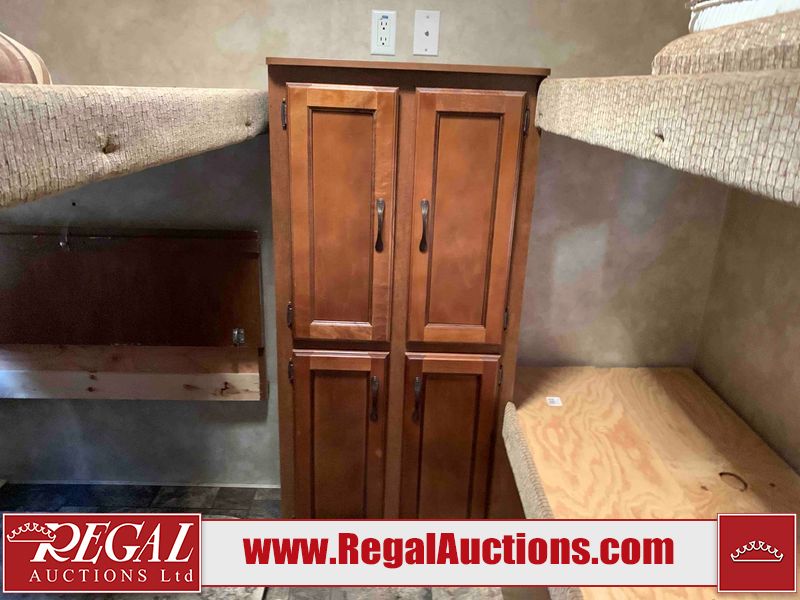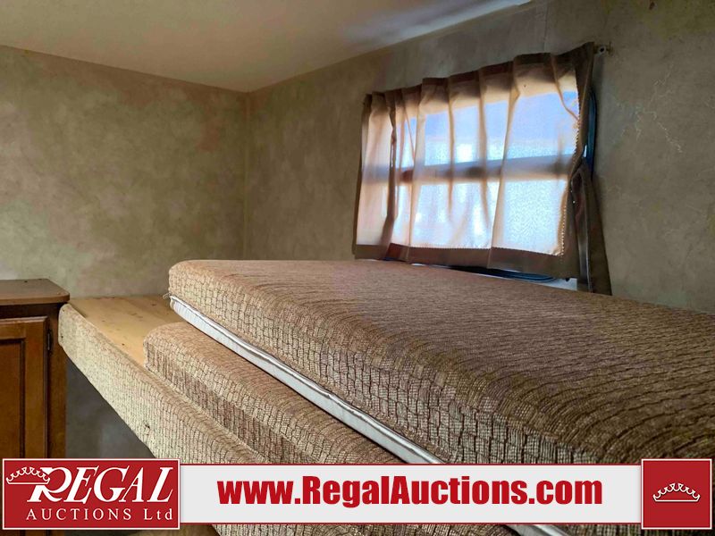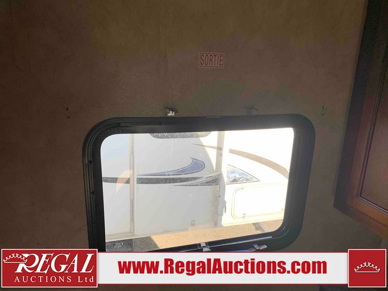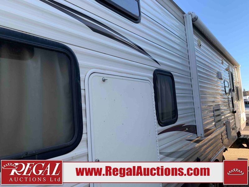 This RV is a 2013 Forest River Catalina 30BHS model tandem axle bumper trailer. It has a single door entry, roof air, single slide out accommodating the living area. The interior is dirty. The mattress is missing. Some walls are showing scratches and scuffs. The master bedroom window curtains are missing and detached. The floor is lifting. The television is missing. The carpet is stained. The couch is stained. The dinette table is removed and sitting in the kitchen area floor. All bunkhouse bed are missing, the bunkhouse walls are showing mildew. All rear sky windows trim is cracked. The refrigerator panels are showing signs of water damage. The exterior walls are made out of soft wall aluminum. The tires are mounted to alloy wheels and appear to be good enough condition to use. All walls are showing scuffs, scratches and chips. The front and left front wall are showing water delamination. Some decals are peeling. The rear wall is dented. The rear right wall lower trim is separating. The right wall has hail damage. This unit gets power with external power applied. The battery is missing. The tires are mounted to alloy rims and appear to be in good enough condition for use. The RV is equipped with a microwave, three burner stove top, oven, refrigerator, and a stereo system. The layout consist of the master bedroom in the front, kitchenette/dinette in the center, and washroom/bunkhouse at the rear.
