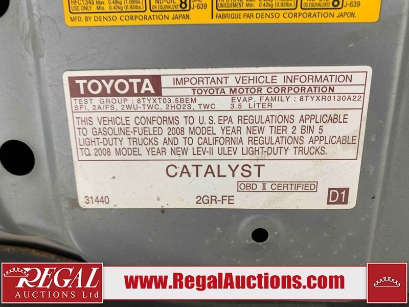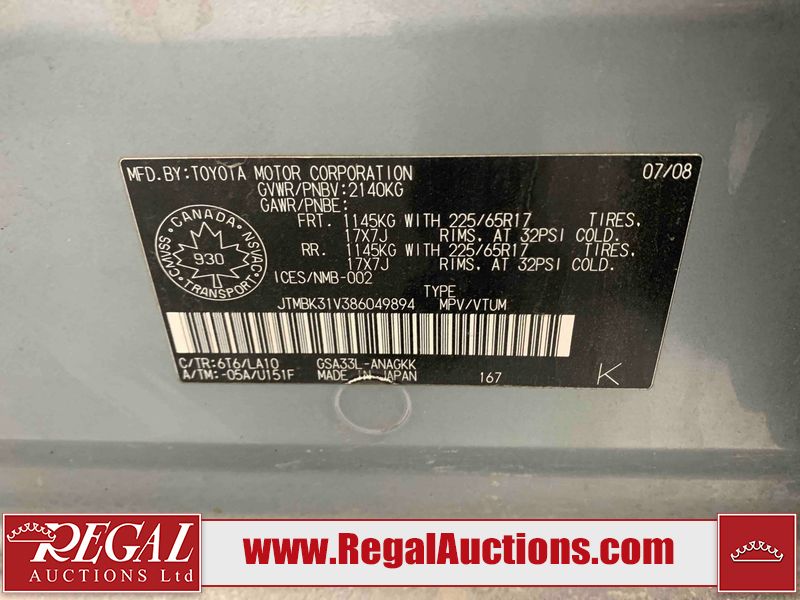 This 2008 TOYOTA RAV4 LIMITED 4D UTILITY is powered by a 3.5L V6 gasoline engine and an automatic transmission. It is equipped with four-wheel drive. The SUV has seats for 5 people. The SUV has high mileage for its age. LIMITED is a very popular trim level. The vehicle has high-value options, including a sunroof and heated seats. The body looks to be in fair condition overall. There are chips on the front bumper, hood, roof, left front fender, left front door, left rear door, left rear fender, rear bumper, rear door, right front door, and right front fender. There are scratches on the front bumper, hood, roof, left front door, left rear door, left rear fender, rear bumper, rear door, and right front fender. The hood has parts missing. There is incidental dent damage on the right rear door. There are very minor chips in a few areas around the body. There are very minor scratches in some areas around the body. The headlights are broken. The interior looks to be in good condition overall. The windshield looks to be in good condition. The tires are all worn. This SUV is being sold by a franchise dealership. The vehicle will be sold with the following declarations: Dealership Trade-In (See Footnote 1). Footnotes: 1) This vehicle is being sold on behalf of a franchise dealership. Franchise Dealerships are automotive sales companies who are directly connected to an automotive manufacturer like Ford, Tesla, Honda, BMW, or similar. Regal Auctions Ltd. makes no guarantee or warranty, either express or implied, with respect to the data provided in this report. The information has been provided from the consignor and from sources generally believed to be reliable, however the accuracy of this information cannot be guaranteed by Regal Auctions.