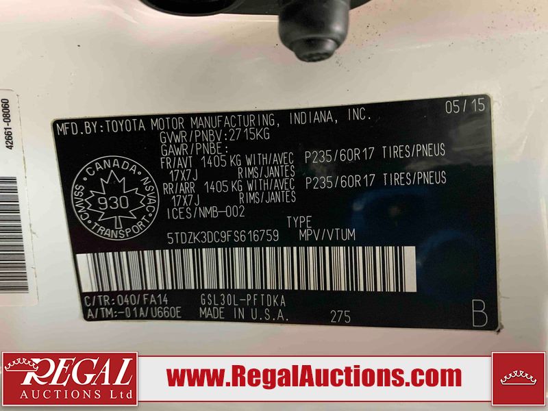 This 2015 TOYOTA SIENNA VAN is powered by a V6 gasoline engine and an automatic transmission. The van has seats for 7 people. The van has low mileage for its age. The vehicle has high-value options, including a backup camera. The Tire Pressure light is on. The body looks to be in fair condition overall. There is conspicuous hail on the hood and roof. There is conspicuous rust on the left rear door. There are noteworthy scratches on the rear bumper. There are chips on the front bumper. There are scratches on the front bumper. There are very minor chips in many areas around the body. There are very minor scratches in many areas around the body. The interior looks to be in good condition overall. The windshield is cracked. All of the tires have lots of tread remaining. This van is being sold by an automotive broker. Regal Auctions Ltd. makes no guarantee or warranty, either express or implied, with respect to the data provided in this report. The information has been provided from the consignor and from sources generally believed to be reliable, however the accuracy of this information cannot be guaranteed by Regal Auctions.