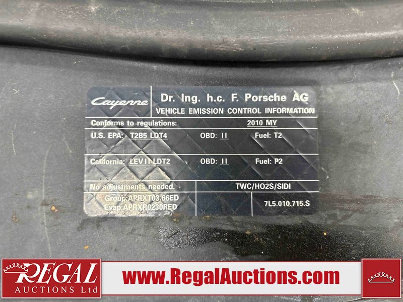 This 2010 PORSCHE CAYENNE 4WD 4D UTILITY is powered by a 3.6 liter 6 cylinder gasoline engine and an automatic transmission. It is equipped with four wheel drive. The SUV has seats for 5 people. The SUV has low mileage for its age. The vehicle has high value options including a sunroof, leather upholstery, and power seats. The body looks to be in fair condition overall. There are incidental chips on the hood, left rear door, and right front door. There is rust on the left rear door and right front door. There are scratches on the left rear fender, rear bumper, rear door, and right rear door. There are very minor chips in many areas around the body. There are very minor scratches in many areas around the body. There is very minor dent damage on the left rear fender. The interior looks to be in good condition overall. The windshield is chipped. All of the tires have lots of tread remaining. This SUV is being sold by an automotive broker. Regal Auctions Ltd. makes no guarantee or warranty, either express or implied, with respect to the data provided in this report. The information has been provided from the consignor and from sources generally believed to be reliable, however the accuracy of this information cannot be guaranteed by Regal Auctions.