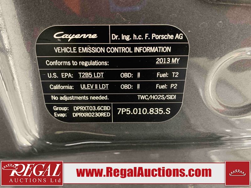 This 2013 PORSCHE CAYENNE 4D UTILITY is powered by a 3.6 liter 6-cylinder gasoline engine and an automatic transmission. It is equipped with all-wheel drive. The SUV has seats for 5 people. The SUV has low mileage for its age. The vehicle has high-value options, including a sunroof, leather upholstery, power seats, heated seats, navigation, and a backup camera. The body looks to be in good condition overall. The grille is cracked. There are very minor chips in many areas around the body. There are very minor scratches in many areas around the body. The interior looks to be in good condition overall. The windshield is chipped. All of the tires have lots of tread remaining. This SUV is being sold by an automotive broker. The vehicle will be sold with the following declarations: Out of Province - AB OVERRIDE (See Footnote 1), Claims Total Above $20,000 (See Footnote 2), and Out of Province - BC (See Footnote 3). Footnotes: 1) Out of province inspection for registering the vehicle in Alberta has been completed. 2) The vehicle's total recorded insurance claims history is above $20,000. This is the amount of money that was paid out by an insurance company for repairs to cover claims against the vehicle's insurance policy. This information is provided by CarFax. 3) The vehicle's last registered jurisdiction is British Columbia. The purchaser must have the vehicle undergo and pass an Out of Province inspection before it can be registered in Alberta. Regal Auctions Ltd. makes no guarantee or warranty, either express or implied, with respect to the data provided in this report. The information has been provided from the consignor and from sources generally believed to be reliable, however the accuracy of this information cannot be guaranteed by Regal Auctions.