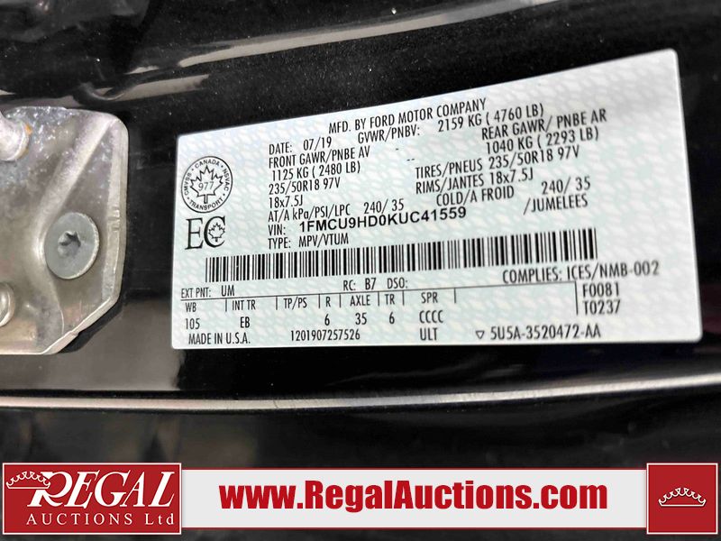 This 2019 FORD ESCAPE SEL 4D UTILITY 4WD is powered by a 1.5 liter 4-cylinder gasoline engine and an automatic transmission. It is equipped with four-wheel drive. The SUV has seats for 5 people. The SUV has high mileage for its age. The vehicle has high-value options, including a sunroof, leather upholstery, power seats, and a backup camera. The body looks to be in good condition overall. There are slight chips on the hood and left rear door. There is dent damage on the right front door. There is slight rust on the right front door. There are very minor chips in many areas around the body. There are very minor scratches in many areas around the body. There is very minor dent damage on the right rear door. The interior looks to be in good condition overall. The windshield is cracked. The driver side mirror is broken. All of the tires are nearly bald and should be replaced. This SUV is being sold by an automotive broker. The vehicle will be sold with the following declarations: Out of Province - BC (See Footnote 1). Footnotes: 1) The vehicle's last registered jurisdiction is British Columbia. The purchaser must have the vehicle undergo and pass an Out of Province inspection before it can be registered in Alberta. Regal Auctions Ltd. makes no guarantee or warranty, either express or implied, with respect to the data provided in this report. The information has been provided from the consignor and from sources generally believed to be reliable, however the accuracy of this information cannot be guaranteed by Regal Auctions.