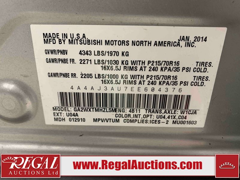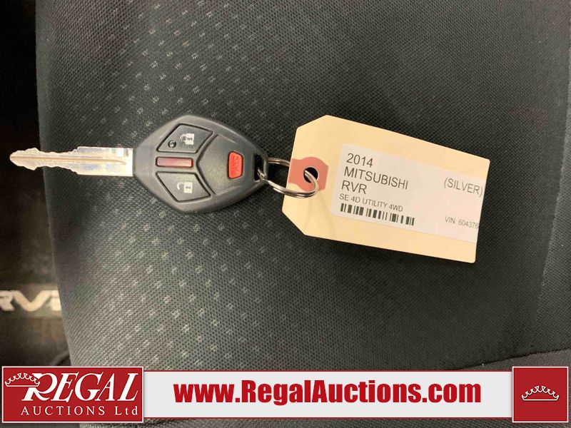 This 2014 MITSUBISHI RVR SE 4D UTILITY AWD is powered by a 2.0 liter 4-cylinder gasoline engine and an automatic transmission. It is equipped with all-wheel drive. The SUV has seats for 5 people. The SUV has low mileage for its age. The vehicle has high-value options, including heated seats. The Tire Pressure and Traction Control lights are on. The body looks to be in good condition overall. There are minimal chips on the front bumper. There is paint fade on the hood and roof. There are scratches on the rear bumper. There are scratches in many areas around the body. There are chips in many areas around the body. The interior looks to be in good condition overall. The driver side mirror is broken. All of the tires have lots of tread remaining. This SUV is being sold by an automotive broker. The vehicle will be sold with the following declarations: Out of Province - BC (See Footnote 1). Footnotes: 1) The vehicle's last registered jurisdiction is British Columbia. The purchaser must have the vehicle undergo and pass an Out of Province inspection before it can be registered in Alberta. Regal Auctions Ltd. makes no guarantee or warranty, either express or implied, with respect to the data provided in this report. The information has been provided from the consignor and from sources generally believed to be reliable, however the accuracy of this information cannot be guaranteed by Regal Auctions.