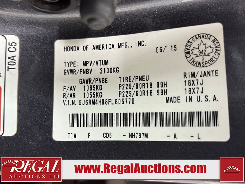 This 2015 HONDA CR-V TOURING 4D UTILITY AWD is powered by a 4-cylinder gasoline engine and an automatic transmission. It is equipped with all-wheel drive. The SUV has seats for 5 people. The mileage is average considering the SUV's age. The vehicle has high-value options, including a sunroof, leather upholstery, power seats, navigation, and a backup camera. The General light is on. The body looks to be in fair condition overall. There are scratches on the front bumper, left front door, and left rear door. There is minimal rust on the hood. There are chips in many areas around the body. There are scratches in many areas around the body. There is dent damage on the hood. The interior looks to be in good condition overall. The windshield is chipped. All of the tires have lots of tread remaining. This SUV is being sold by an automotive broker. The vehicle will be sold with the following declarations: Claims Total $5000 - $9999 (See Footnote 1). Footnotes: 1) The vehicle's total recorded insurance claims history is between $5,000 - $9,999. This is the amount of money that was paid out by an insurance company for repairs to cover claims against the vehicle's insurance policy. This information is provided by CarFax. Regal Auctions Ltd. makes no guarantee or warranty, either express or implied, with respect to the data provided in this report. The information has been provided from the consignor and from sources generally believed to be reliable, however the accuracy of this information cannot be guaranteed by Regal Auctions.