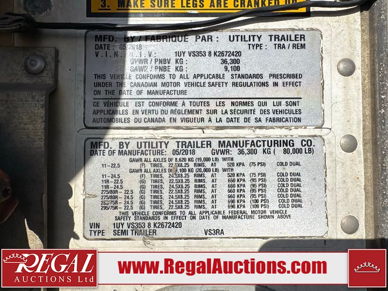 This unit is a 2019 Utility 53ft VS3RA tridem reefer trailer. This unit is equipped with a Carrier 7300 X4 refrigerator unit. The hour meter reads 12,916 hours and 24,851 switch on hours. It has a GVWR of 80,000 pounds. It has a CVIP of 07/26. The interior walls are showing scratches and scuffs. This unit is equipped with a steel/aluminum combination frame. All walls are showing scratches, scuffs, and dents. The reefer engine starts and runs without boost. The tires are mounted to alloy rims and appear to be in good enough condition for use. One of the dolly legs does not raise or lower. This unit is equipped with air suspension, and ABS.