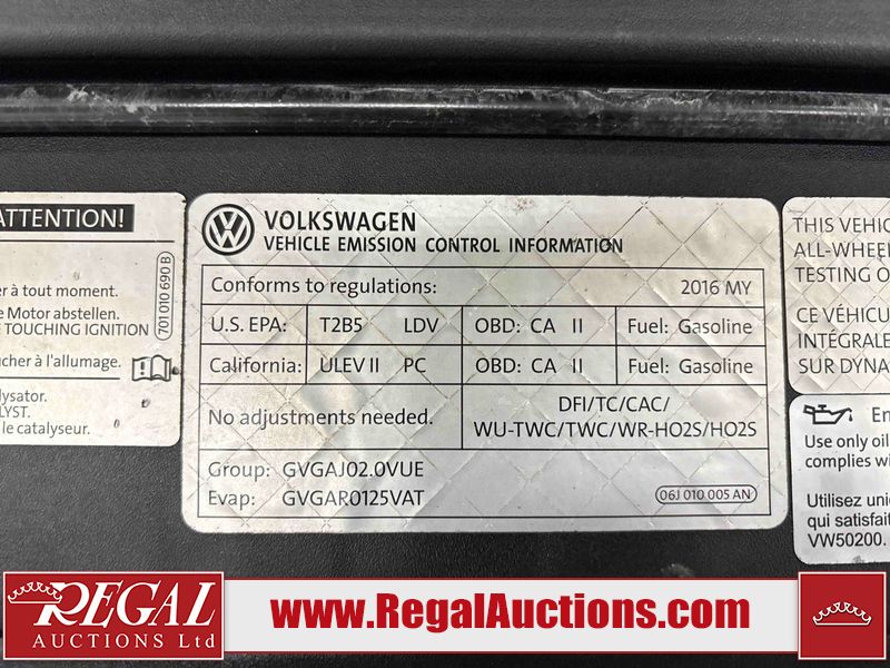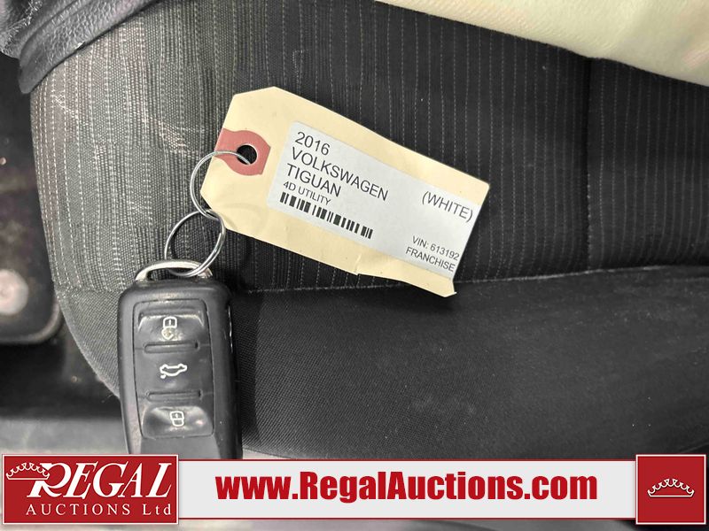 This 2016 VOLKSWAGEN TIGUAN 4D UTILITY is powered by a 2.0 liter 4-cylinder gasoline engine and an automatic transmission. It is equipped with all-wheel drive. The SUV has seats for 5 people. The mileage is average considering the SUV's age. The vehicle has high-value options, including heated seats and a backup camera. The body looks to be in fair condition overall. The rear bumper is broken. There are incidental chips on the front bumper and hood. There is incidental dent damage on the roof. There is minimal rust on the left rear fender. There are scratches on the rear bumper. There are scratches in many areas around the body. There are chips in many areas around the body. The interior looks to be in good condition overall. The windshield is chipped. The rear tires are worn. The front tires have lots of tread remaining. This SUV is being sold by a franchise dealership. The vehicle will be sold with the following declarations: Dealership Trade-In (See Footnote 1). Footnotes: 1) This vehicle is being sold on behalf of a franchise dealership. Franchise Dealerships are automotive sales companies who are directly connected to an automotive manufacturer like Ford, Tesla, Honda, BMW, or similar. Regal Auctions Ltd. makes no guarantee or warranty, either express or implied, with respect to the data provided in this report. The information has been provided from the consignor and from sources generally believed to be reliable, however the accuracy of this information cannot be guaranteed by Regal Auctions.