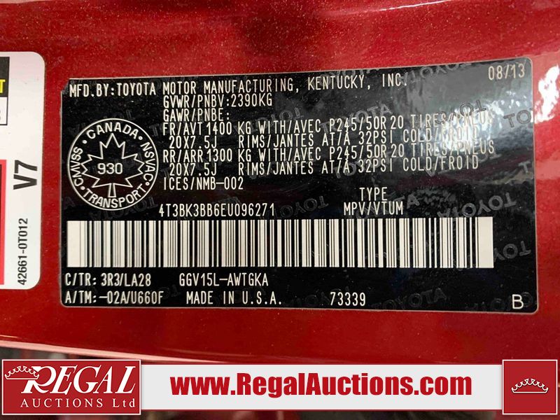 This 2014 TOYOTA VENZA LIMITED 4D UTILITY AWD is powered by a 3.5 liter 6 cylinder gasoline engine and an automatic transmission. It is equipped with four wheel drive. The SUV has seats for 5 people. The SUV has low mileage for its age. LIMITED is a very popular trim level. The vehicle has high value options including a sunroof, leather upholstery, power seats, heated seats, a backup camera, and a power lift gate. The body looks to be in fair condition overall. There is some paint fade on the roof. There is some rust on the left rear fender and rear door. There are slight chips on the front bumper and hood. There are scratches on the rear bumper, right rear fender, right rear door, and right front door. There is minimal paint fade on the rear door. There are chips in many areas around the body. There are scratches in some areas around the body. The interior looks to be in good condition overall. The windshield is cracked. All of the tires have lots of tread remaining. This SUV is being sold by a private individual. The vehicle will be sold with the following declarations: Auctioneer Announcement "*SHOCKS AND/OR STRUTS ARE LEAKING* ". Regal Auctions Ltd. makes no guarantee or warranty, either express or implied, with respect to the data provided in this report. The information has been provided from the consignor and from sources generally believed to be reliable, however the accuracy of this information cannot be guaranteed by Regal Auctions.