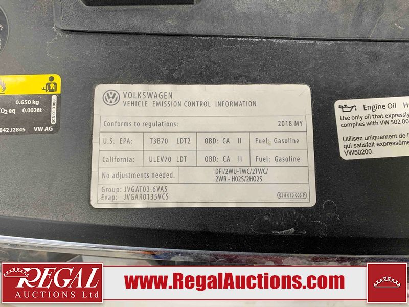 This 2018 VOLKSWAGEN ATLAS TERAMONT 4D UTILITY is powered by a 3.6 liter 6 cylinder gasoline engine and an automatic transmission. It is equipped four all wheel drive. The SUV has seats for 7 people. The SUV has low mileage for its age. The vehicle has high value options including heated seats and a backup camera. The Check Engine light is on. The body looks to be in good condition overall. There are slight chips on the front bumper and hood. There are minor scratches on the rear bumper and rear door. There is slight rust on the rear door. There are chips in many areas around the body. There are scratches in a few areas around the body. The interior looks to be in good condition overall. The windshield looks to be in good condition. The front tires and the passenger side rear tire are all worn. The driver's side rear tire has lots of tread left. This SUV is being sold by a franchise dealership. The vehicle will be sold with the following declarations: Dealership Trade-In (See Footnote 1). Footnotes: 1) This vehicle is being sold on behalf of a franchise dealership. Franchise Dealerships are automotive sales companies who are directly connected to an automotive manufacturer like Ford, Tesla, Honda, BMW, or similar. Regal Auctions Ltd. makes no guarantee or warranty, either express or implied, with respect to the data provided in this report. The information has been provided from the consignor and from sources generally believed to be reliable, however the accuracy of this information cannot be guaranteed by Regal Auctions.