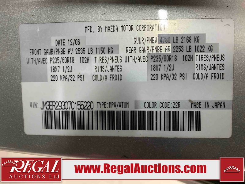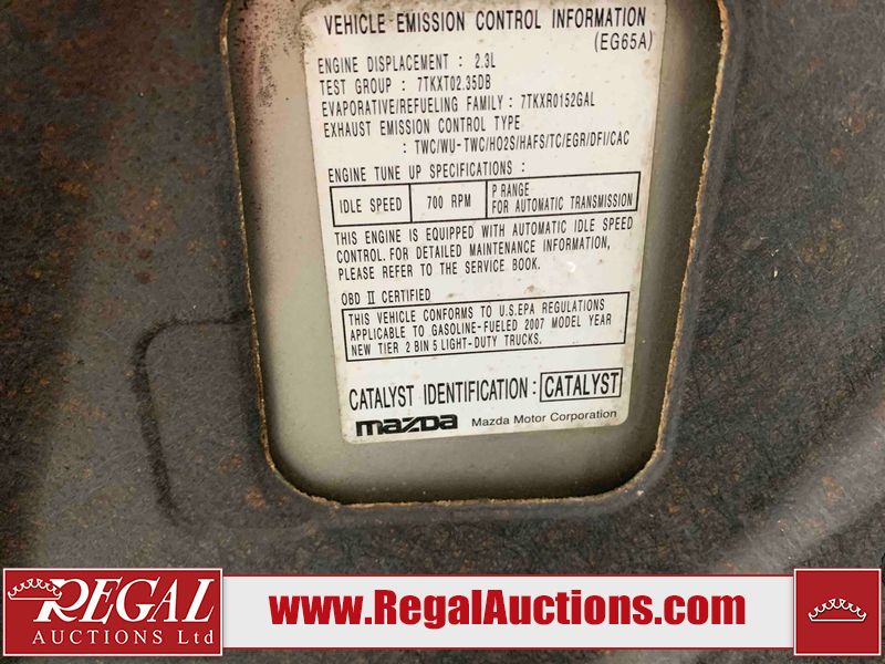 This 2007 MAZDA CX-7 4D UTILITY is powered by a turbocharged 2.3 liter 4 cylinder gasoline engine and an automatic transmission. It is a two wheel drive model. The SUV has seats for 5 people. The SUV has low mileage for its age. The vehicle has high value options including a sunroof. The Airbag light is on. The body looks to be in fair condition overall. There is a fair amount of paint overspray on the rear bumper. There are incidental chips on the front bumper. There are slight scratches on the front bumper, left front door, left rear door, left rear fender, and rear bumper. There is minimal rust on the left rear fender. There is incidental dent damage on the right rear fender. There are chips in a few areas around the body. There are scratches in a few areas around the body. There is dent damage on the right front fender. The interior looks to be in good condition overall. The windshield looks to be in good condition. The front tires are both worn. The rear tires both have lots of tread remaining. This SUV is being sold by an automotive broker. The vehicle will be sold with the following declarations: Claims Total $1000 - $2999 (See Footnote 1), Out of Province - BC (See Footnote 2), and Out of Province - AB OVERRIDE (See Footnote 3). Footnotes: 1) The vehicle's total recorded insurance claims history is between $1,000 - $2,999. This is the amount of money that was paid out by an insurance company for repairs to cover claims against the vehicle's insurance policy. This information is provided by CarFax. 2) The vehicle's last registered jurisdiction is British Columbia. The purchaser must have the vehicle undergo and pass an Out of Province inspection before it can be registered in Alberta. 3) Out of province inspection for registering the vehicle in Alberta has been completed. Regal Auctions Ltd. makes no guarantee or warranty, either express or implied, with respect to the data provided in this report. The information has been provided from the consignor and from sources generally believed to be reliable, however the accuracy of this information cannot be guaranteed by Regal Auctions.