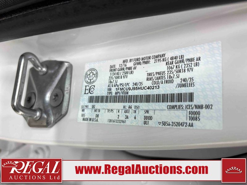 This 2017 FORD ESCAPE TITANIUM 4D UTILITY is powered by a 2.0 liter 4-cylinder gasoline engine and an automatic transmission. It is equipped with four-wheel drive. The SUV has seats for 5 people. The mileage is average considering the SUV's age. The vehicle has high-value options, including a sunroof, leather upholstery, power seats, heated seats, navigation, and a backup camera. The Check Engine and Brake System lights are on. The body looks to be in good condition overall. There are incidental chips on the front bumper. There is minimal rust on the roof. There are scratches in many areas around the body. There are chips in many areas around the body. There is dent damage on the hood. The interior looks to be in good condition overall. The windshield is cracked. The rear tires are worn. The front tires have lots of tread remaining. This SUV is being sold by a franchise dealership. The vehicle will be sold with the following declarations: Dealership Trade-In (See Footnote 1). Footnotes: 1) This vehicle is being sold on behalf of a franchise dealership. Franchise Dealerships are automotive sales companies who are directly connected to an automotive manufacturer like Ford, Tesla, Honda, BMW, or similar. Regal Auctions Ltd. makes no guarantee or warranty, either express or implied, with respect to the data provided in this report. The information has been provided from the consignor and from sources generally believed to be reliable, however the accuracy of this information cannot be guaranteed by Regal Auctions.