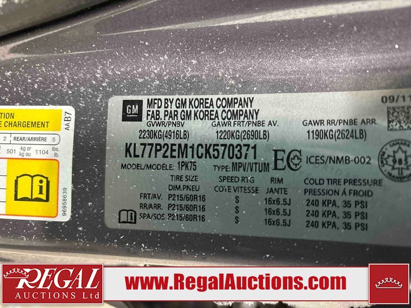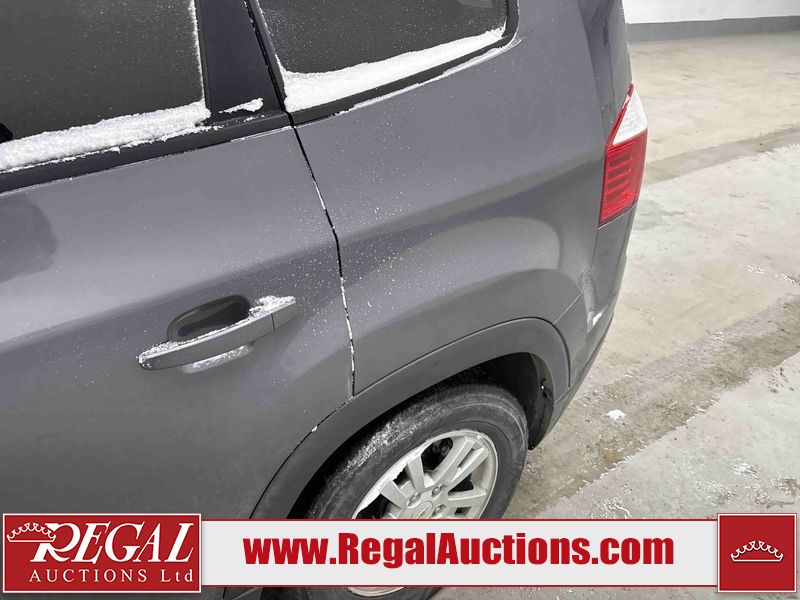 This 2012 CHEVROLET ORLANDO LT 4D UTILITY is powered by a 2.4 liter 4-cylinder gasoline engine and an automatic transmission. It is a two-wheel drive model. The SUV has seats for 5 people. The SUV has low mileage for its age. The body looks to be in fair condition overall. There is a fair amount of hail on the hood and roof. There is minimal hail on the rear door. There are minimal scratches on the right front door. There are minimal chips on the right front fender. There are chips in many areas around the body. There are scratches in many areas around the body. The interior looks to be in good condition overall. The windshield is chipped. All of the tires are nearly bald and should be replaced. This SUV is being sold by an automotive broker. The vehicle will be sold with the following declarations: Claims Total $3000 - $4999 (See Footnote 1) and Hail Damage (See Footnote 2). Footnotes: 1) The vehicle's total recorded insurance claims history is between $3,000 - $4,999. This is the amount of money that was paid out by an insurance company for repairs to cover claims against the vehicle's insurance policy. This information is provided by CarFax. 2) This vehicle shows signs of damage from a hail storm. Hail damage is not always clearly visible in photographs. Regal Auctions Ltd. makes no guarantee or warranty, either express or implied, with respect to the data provided in this report. The information has been provided from the consignor and from sources generally believed to be reliable, however the accuracy of this information cannot be guaranteed by Regal Auctions.