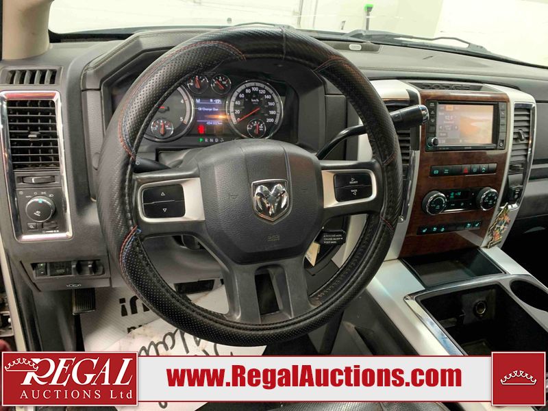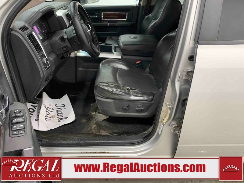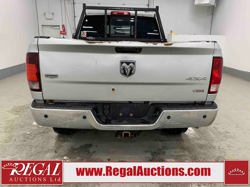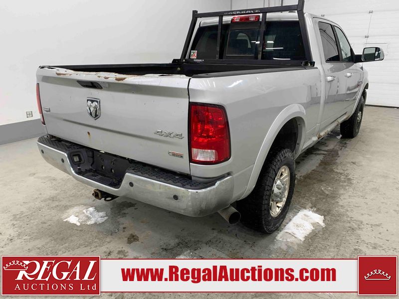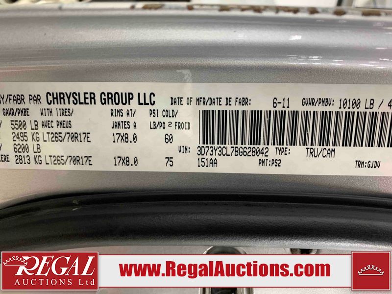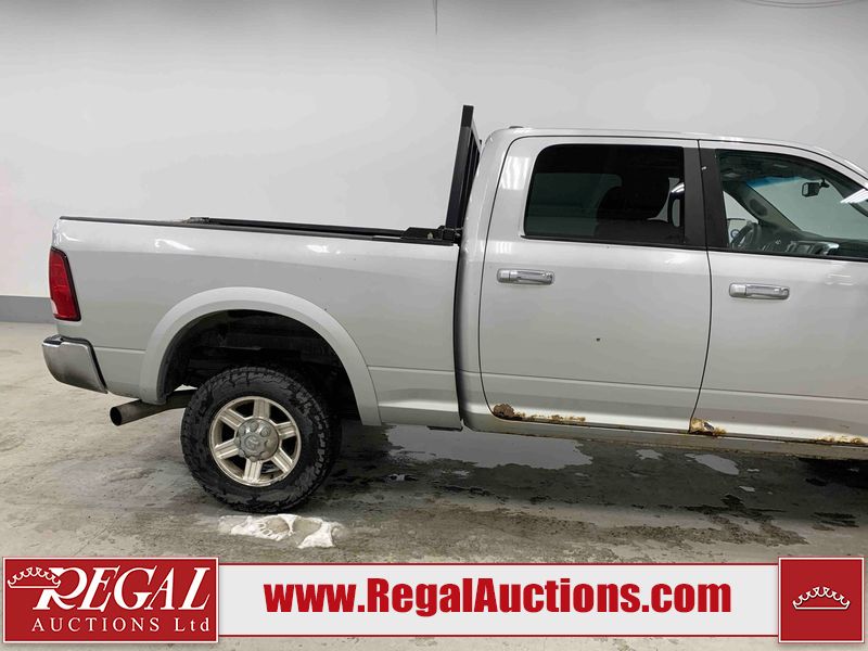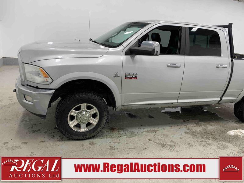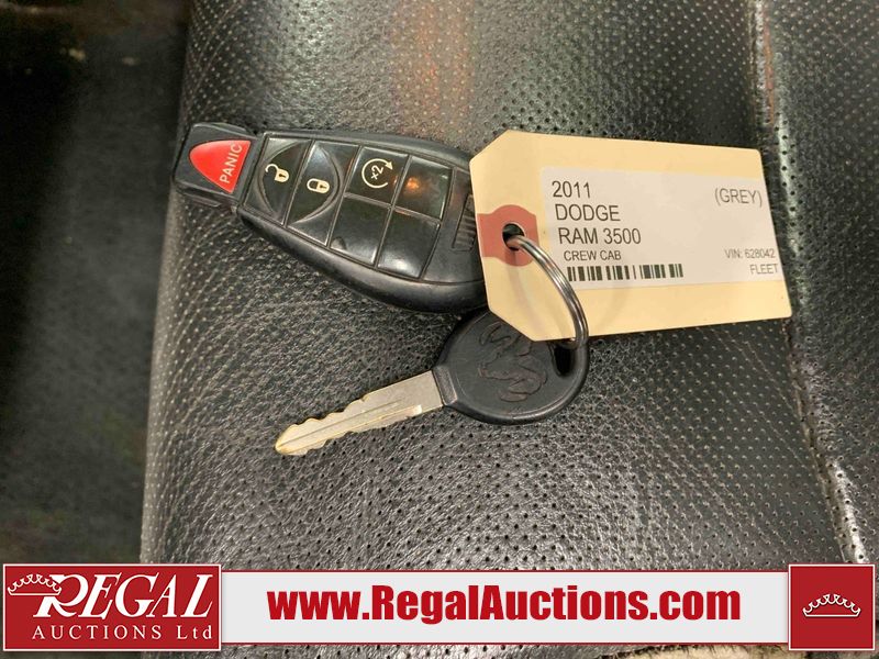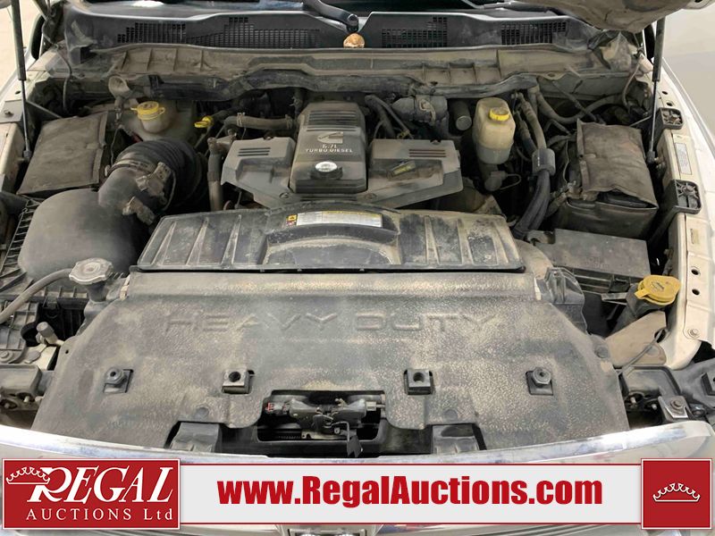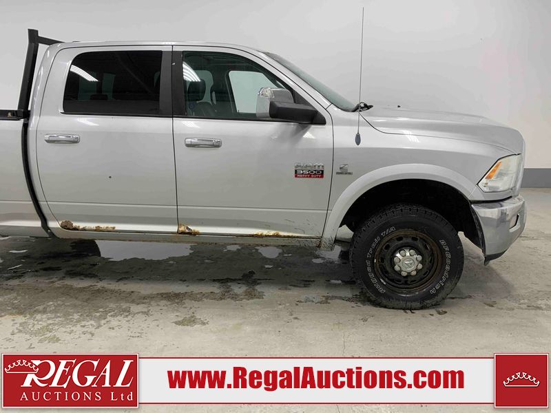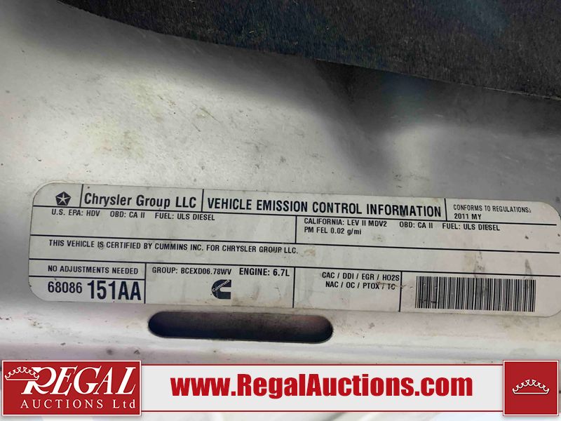 This 2011 DODGE RAM 3500 CREW CAB is powered by a turbocharged 6.7 liter 6-cylinder diesel engine and an automatic transmission. It is equipped with four-wheel drive. The truck has seats for 5 people. The truck has high mileage for its age. The vehicle has high-value options, including leather upholstery, power seats, heated seats, navigation, and a backup camera. The body looks to be in rough condition overall. There is substantial dent damage on the tailgate. There is severe rust on the right rear door and the right front door. There is a fair amount of rust on the roof and tailgate. There is minimal rust on the front bumper, hood, left front fender, left rear fender, and right rear fender. There are minor scratches on the front bumper, left rear fender, and right rear fender. There are minor chips on the hood, left front fender, left front door, left rear door, left rear fender, right rear fender, right front door, and right front fender. There is dent damage on the roof, left rear fender, and right rear fender. There is dent damage on the left front door. There are scratches in a few areas around the body. There are chips on the right rear door. The taillights are broken. The interior looks to be in fair condition overall. The driver's seat is torn. The passenger seat is torn. The roofliner is dirty. The carpet is dirty. The windshield is cracked. All of the tires have lots of tread remaining. This truck is being sold by the fleet department of a corporation or government body. The vehicle will be sold with the following declarations: Fleet Vehicle (See Footnote 1). Footnotes: 1) This vehicle is a commercially owned work vehicle. Regal Auctions Ltd. makes no guarantee or warranty, either express or implied, with respect to the data provided in this report. The information has been provided from the consignor and from sources generally believed to be reliable, however the accuracy of this information cannot be guaranteed by Regal Auctions.