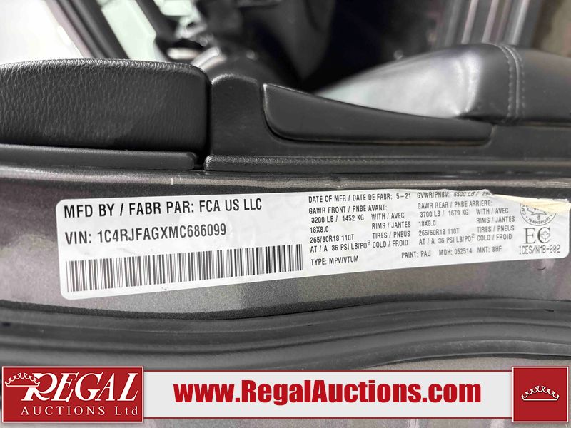 This 2021 JEEP GRAND CHEROKEE 4D UTILITY is powered by a 3.6 liter 6-cylinder gasoline engine and an automatic transmission. It is equipped with four-wheel drive. The SUV has seats for 5 people. The SUV has high mileage for its age. The vehicle has high-value options, including power seats, heated seats, and a backup camera. The Tire Pressure light is on. The body looks to be in good condition overall. There are scratches on the left rear door, right rear fender, and right rear door. There are chips in many areas around the body. There are scratches in many areas around the body. The interior looks to be in good condition overall. There are obvious stains on the driver's seat. The windshield is cracked. All of the tires have lots of tread remaining. This SUV is being sold by a franchise dealership. The vehicle will be sold with the following declarations: Dealership Trade-In (See Footnote 1). Footnotes: 1) This vehicle is being sold on behalf of a franchise dealership. Franchise Dealerships are automotive sales companies who are directly connected to an automotive manufacturer like Ford, Tesla, Honda, BMW, or similar. Regal Auctions Ltd. makes no guarantee or warranty, either express or implied, with respect to the data provided in this report. The information has been provided from the consignor and from sources generally believed to be reliable, however the accuracy of this information cannot be guaranteed by Regal Auctions.