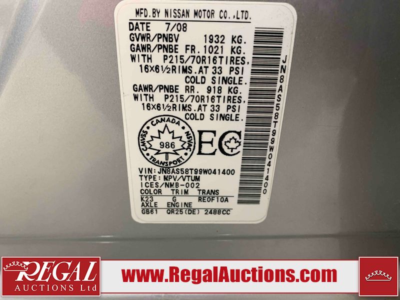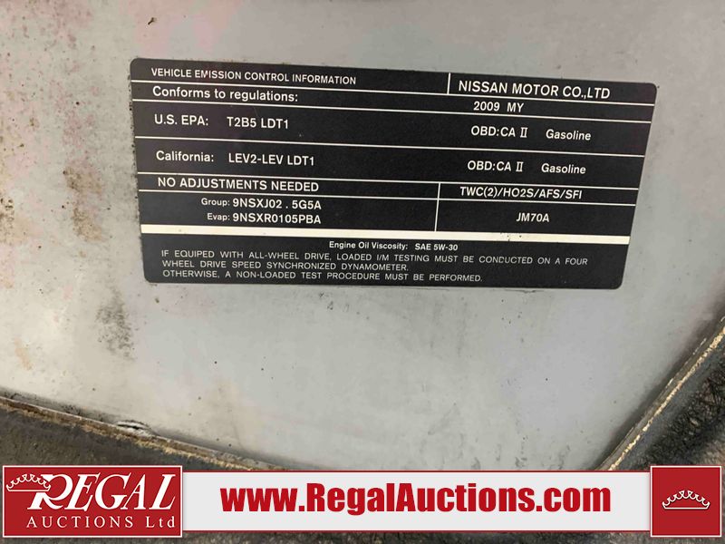 This 2009 NISSAN ROGUE 4D UTILITY FWD is powered by a 2.5 liter 4-cylinder gasoline engine and an automatic transmission. It is a two-wheel drive model. The SUV has seats for 5 people. The mileage is average considering the SUV's age. The Flashing Airbag light and Tire Pressure lights are on. The body looks to be in rough condition overall. There is severe rust on the left rear fender. There are a fair amount of scratches on the front bumper. There is some rust on the roof, left front door, left rear door, and right rear fender. There is a fair amount of hail on the roof. The rear bumper is cracked. There are incidental chips on the front bumper, hood, and right front fender. There is incidental paint overspray on the front bumper and right rear fender. There is dent damage on the hood, left front door, right rear door, right front door, and right front fender. There are slight scratches on the left front fender, left front door, left rear door, left rear fender, rear bumper, right rear door, and right front door. There is minimal rust on the rear door. There are chips on the left front fender. The interior looks to be in fair condition overall. There are a fair number of stains on the rear seats. There are stains on the driver's seat and the passenger seat. The windshield is cracked. All of the tires have lots of tread remaining. This SUV is being sold by a private individual. The vehicle will be sold with the following declarations: Hail Damage (See Footnote 1). Footnotes: 1) This vehicle shows signs of damage from a hail storm. Hail damage is not always clearly visible in photographs. Regal Auctions Ltd. makes no guarantee or warranty, either express or implied, with respect to the data provided in this report. The information has been provided from the consignor and from sources generally believed to be reliable, however the accuracy of this information cannot be guaranteed by Regal Auctions.