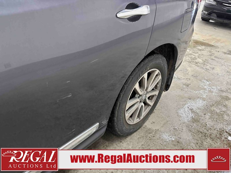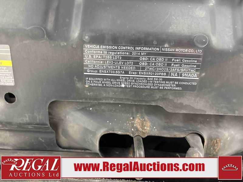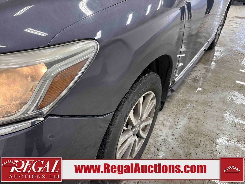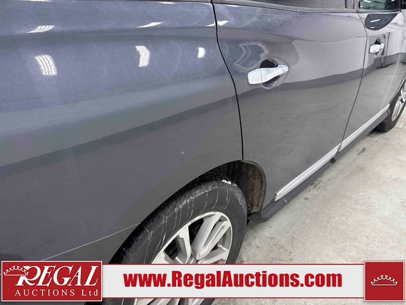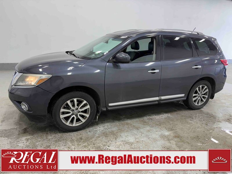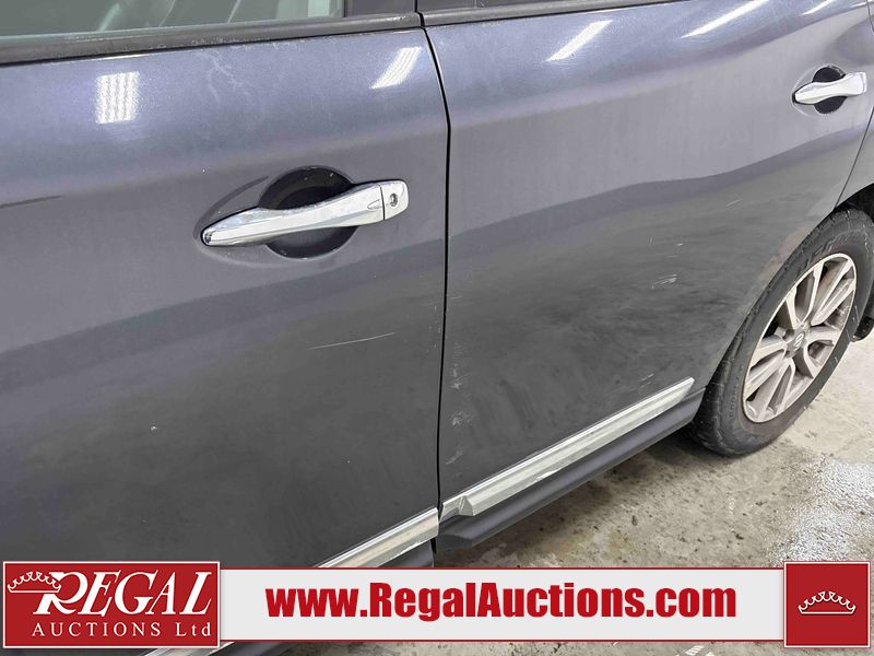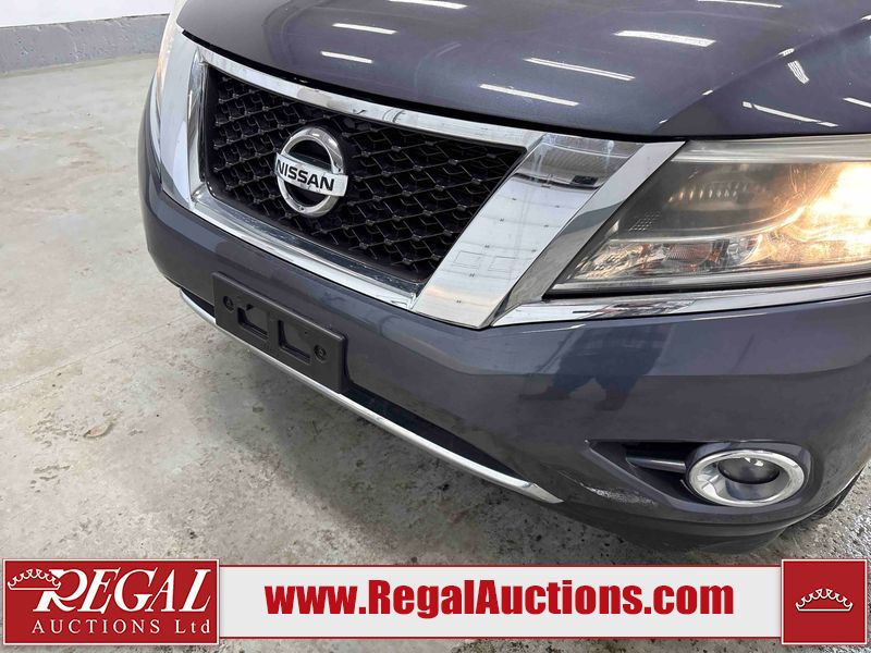 This 2014 NISSAN PATHFINDER SL 4D UTILITY 4WD is powered by a 3.5 liter 6-cylinder gasoline engine and an automatic transmission. It is equipped with four-wheel drive. The SUV has seats for 7 people. The SUV has low mileage for its age. The vehicle has high-value options, including leather upholstery, power seats, heated seats, navigation, and a backup camera. The body looks to be in fair condition overall. The front bumper is broken. The hood, left front fender, and right front fender have been repainted poorly. There are chips on the hood. There is minor dent damage on the left front fender. There are scratches on the left front door, left rear door, left rear fender, right rear fender, right rear door, and right front door. There are chips in many areas around the body. There are scratches in many areas around the body. There is dent damage on the left rear door. The interior looks to be in good condition overall. The windshield is chipped. The driver's side rear tire is nearly bald and should be replaced. The driver's side front tire and the passenger side rear tire are both worn. This SUV is being sold by an automotive broker. The vehicle will be sold with the following declarations: Out of Province (See Footnote 1), Out of Province - AB OVERRIDE (See Footnote 2), Claims Total $15,000 - $19,999 (See Footnote 3), and Out of Province - BC (See Footnote 4). Footnotes: 1) The vehicle's last jurisdiction of registration is not Alberta. The purchaser must have the vehicle undergo and pass an Out of Province inspection before it can be registered in Alberta. 2) Out of province inspection for registering the vehicle in Alberta has been completed. 3) The vehicle's total recorded insurance claims history is between $15,000 - $19,999. This is the amount of money that was paid out by an insurance company for repairs to cover claims against the vehicle's insurance policy. This information is provided by CarFax. 4) The vehicle's last registered jurisdiction is British Columbia. The purchaser must have the vehicle undergo and pass an Out of Province inspection before it can be registered in Alberta. Regal Auctions Ltd. makes no guarantee or warranty, either express or implied, with respect to the data provided in this report. The information has been provided from the consignor and from sources generally believed to be reliable, however the accuracy of this information cannot be guaranteed by Regal Auctions.