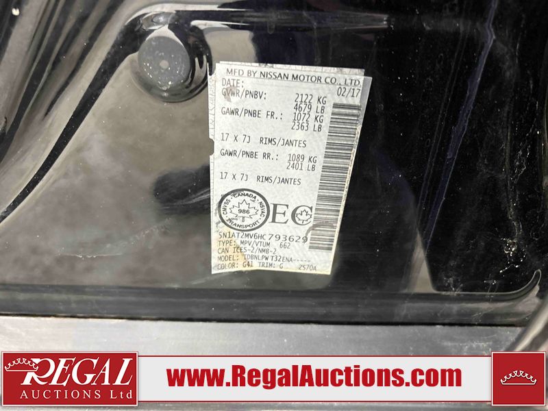 This 2017 NISSAN ROGUE S 4D UTILITY is powered by a 4-cylinder gasoline engine and an automatic transmission. It is equipped with all-wheel drive. The SUV has seats for 5 people. The mileage is average considering the SUV's age. The vehicle has high-value options, including a backup camera. The Tire Pressure and General lights are on. The body looks to be in fair condition overall. The front bumper is broken. There is moderate chrome peeling on the grille. The right front fender is broken. There are incidental chips on the front bumper, hood, and left rear door. There is rust on the roof. There are slight scratches on the left rear fender and right rear fender. There are scratches in many areas around the body. There are chips in many areas around the body. There is dent damage on the right rear door. The interior looks to be in good condition overall. The windshield is cracked. All of the tires have lots of tread remaining. This SUV is being sold by an automotive broker. The vehicle will be sold with the following declarations: Claims Total $5000 - $9999 (See Footnote 1). Footnotes: 1) The vehicle's total recorded insurance claims history is between $5,000 - $9,999. This is the amount of money that was paid out by an insurance company for repairs to cover claims against the vehicle's insurance policy. This information is provided by CarFax. Regal Auctions Ltd. makes no guarantee or warranty, either express or implied, with respect to the data provided in this report. The information has been provided from the consignor and from sources generally believed to be reliable, however the accuracy of this information cannot be guaranteed by Regal Auctions.