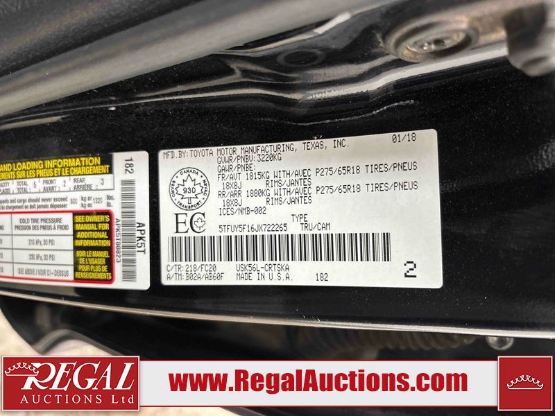 This 2018 TOYOTA TUNDRA 4D CREW CAB is powered by a 8 cylinder gasoline engine and an automatic transmission. It is equipped with four wheel drive. The truck has seats for 5 people. The truck has high mileage for its age. The vehicle has high value options including power seats, heated seats, and a backup camera. The body looks to be in fair condition overall. There are chips on the hood, tail gate, and right rear fender. There is rust on the roof. There is incidental dent damage on the left rear fender. There are chips in many areas around the body. There are scratches in many areas around the body. There is dent damage on the front bumper. The interior looks to be in good condition overall. The windshield is chipped. All of the tires have lots of tread remaining. This truck is being sold by a franchise dealership. The vehicle will be sold with the following declarations: Claims Total $15,000 - $19,999 (See Footnote 1) and Dealership Trade-In (See Footnote 2). Footnotes: 1) The vehicle's total recorded insurance claims history is between $15,000 - $19,999. This is the amount of money that was paid out by an insurance company for repairs to cover claims against the vehicle's insurance policy. This information is provided by CarFax. 2) This vehicle is being sold on behalf of a franchise dealership. Franchise Dealerships are automotive sales companies who are directly connected to an automotive manufacturer like Ford, Tesla, Honda, BMW, or similar. Regal Auctions Ltd. makes no guarantee or warranty, either express or implied, with respect to the data provided in this report. The information has been provided from the consignor and from sources generally believed to be reliable, however the accuracy of this information cannot be guaranteed by Regal Auctions.