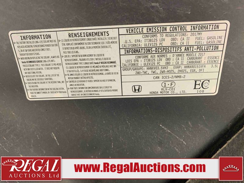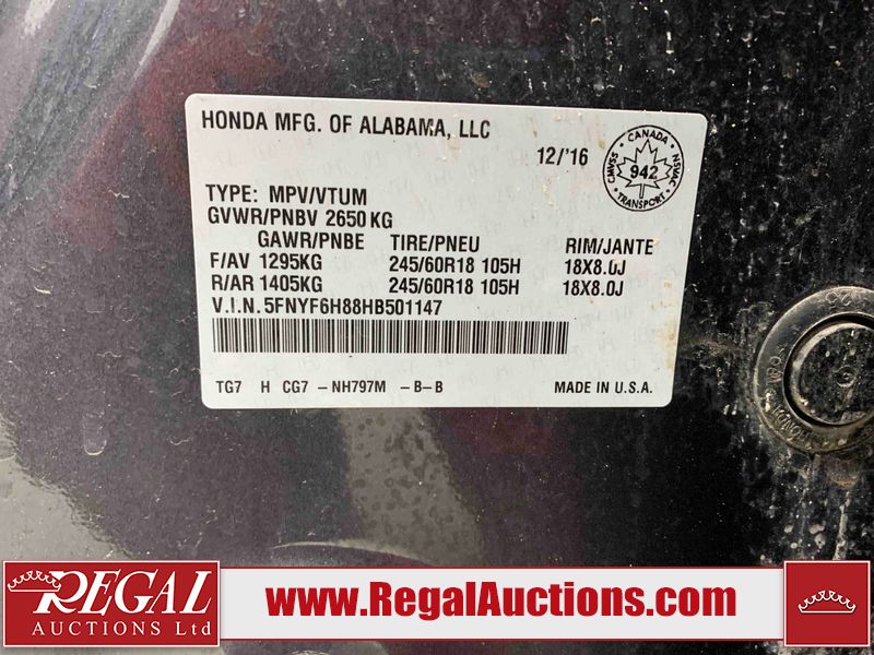 This 2017 HONDA PILOT 4D UTILITY is powered by a 3.5 liter 6 cylinder gasoline engine and an automatic transmission. It is equipped with four wheel drive. The SUV has seats for 8 people. The SUV has high mileage for its age. The vehicle has high value options including a sunroof, leather upholstery, power seats, heated seats, a DVD Player, a backup camera, and a power lift gate. The body looks to be in fair condition overall. There are a fair amount of scratches on the rear bumper and right rear door. There are minimal chips on the front bumper, grille, hood, and left front fender. There are minimal scratches on the left rear fender, right rear fender, right front door, and right front fender. There is incidental dent damage on the rear door. There are scratches in a few areas around the body. There is dent damage in a few areas around the body. The fog lights are broken. The interior looks to be in good condition overall. The windshield is chipped. The tires are all worn. This SUV is being sold by a franchise dealership. The vehicle will be sold with the following declarations: Claims Total $10,000 - $14,999 (See Footnote 1) and Dealership Trade-In (See Footnote 2). Footnotes: 1) The vehicle's total recorded insurance claims history is between $10,000 - $14,999. This is the amount of money that was paid out by an insurance company for repairs to cover claims against the vehicle's insurance policy. This information is provided by CarFax. 2) This vehicle is being sold on behalf of a franchise dealership. Franchise Dealerships are automotive sales companies who are directly connected to an automotive manufacturer like Ford, Tesla, Honda, BMW, or similar. Regal Auctions Ltd. makes no guarantee or warranty, either express or implied, with respect to the data provided in this report. The information has been provided from the consignor and from sources generally believed to be reliable, however the accuracy of this information cannot be guaranteed by Regal Auctions.