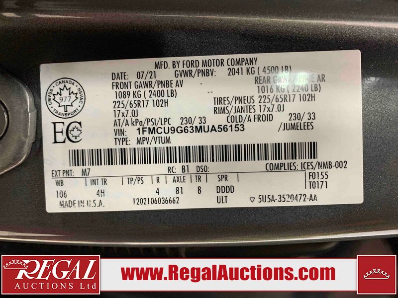 This 2021 FORD ESCAPE SE 4D UTILITY AWD is powered by a 1.5 liter 3 cylinder gasoline engine and an automatic transmission. It is equipped with all wheel drive. The SUV has seats for 5 people. The mileage is average considering the SUV's age. The vehicle has high value options including heated seats and a backup camera. The Check Engine light is on. The body looks to be in good condition overall. There are chips on the hood. There is dent damage on the rear bumper. There are chips in a few areas around the body. There is dent damage in a few areas around the body. There are scratches in many areas around the body. The interior looks to be in good condition overall. The windshield looks to be in good condition. The passenger side rear tire is nearly bald and should be replaced. All of the other tires have lots of tread remaining. This SUV is being sold by an automotive broker. Regal Auctions Ltd. makes no guarantee or warranty, either express or implied, with respect to the data provided in this report. The information has been provided from the consignor and from sources generally believed to be reliable, however the accuracy of this information cannot be guaranteed by Regal Auctions.