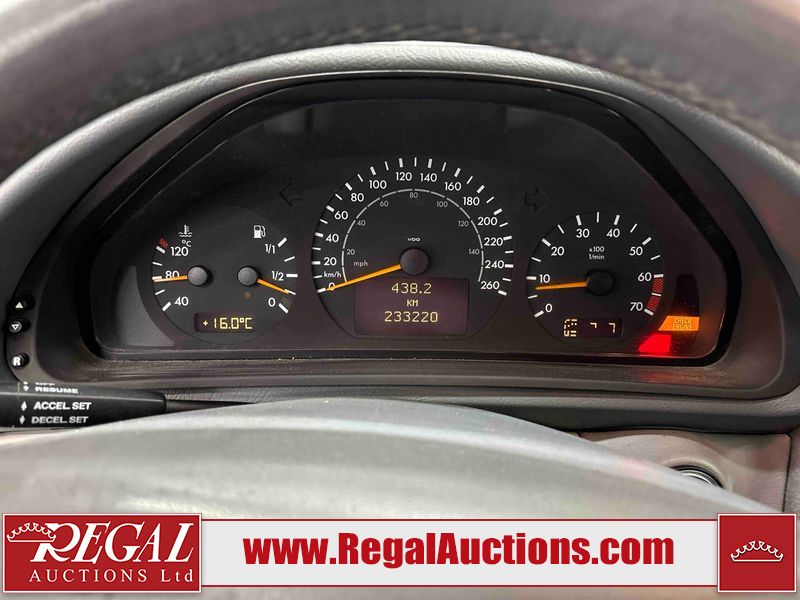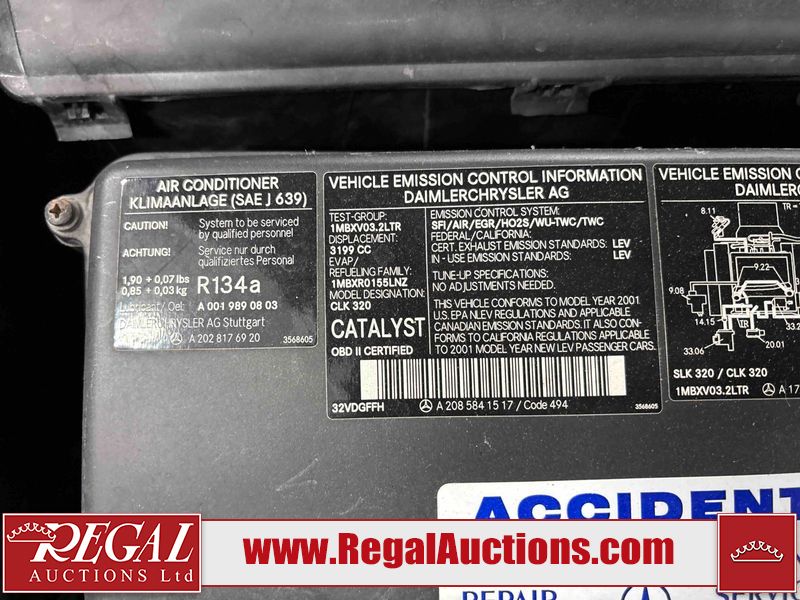 This 2001 MERCEDES-BENZ CLK-CLASS 2D CONVERTIBLE is powered by a 3.2L V6 gasoline engine and an automatic transmission. The car has seats for 4 people. The vehicle has high-value options including leather upholstery, power seats, heated seats, and a convertible top. The Check Engine and Airbag lights are on. The body looks to be in rough condition overall. There is considerable rust on the right front door. The front bumper is cracked. There is pronounced paint fade on the front bumper. There is pronounced rust on the left front fender. The left front fender has been repainted poorly. There are minor chips on the front bumper and grille. There are incidental scratches on the left front door, left rear fender, rear bumper, right rear fender, and right front fender. There is minor rust on the left rear fender, right rear fender, and right front fender. The left rear fender has been repainted poorly. There are very minor scratches in many areas around the body. There are very minor chips in many areas around the body. There is very minor dent damage on the right front fender. The interior looks to be in good condition overall. The windshield is chipped. Both driver's side tires are worn. Both passenger side tires have lots of tread remaining. This car is being sold by a private individual. The vehicle will be sold with the following declarations: Auctioneer Announcement "**AC REQUIRES REPAIR**AIRBAG LIGHT ON** " and True Mileage Unknown (See Footnote 1). Footnotes: 1) The accuracy and history of the odometer reading cannot be verified and the current odometer reading is not believed to be correct. Regal Auctions Ltd. makes no guarantee or warranty, either express or implied, with respect to the data provided in this report. The information has been provided from the consignor and from sources generally believed to be reliable, however the accuracy of this information cannot be guaranteed by Regal Auctions.