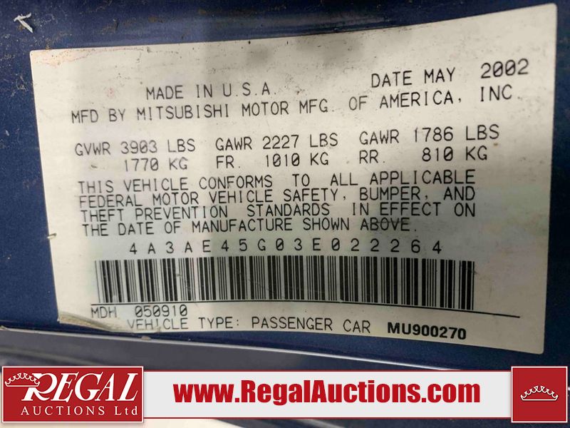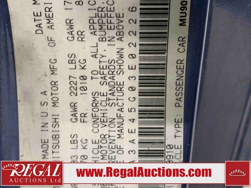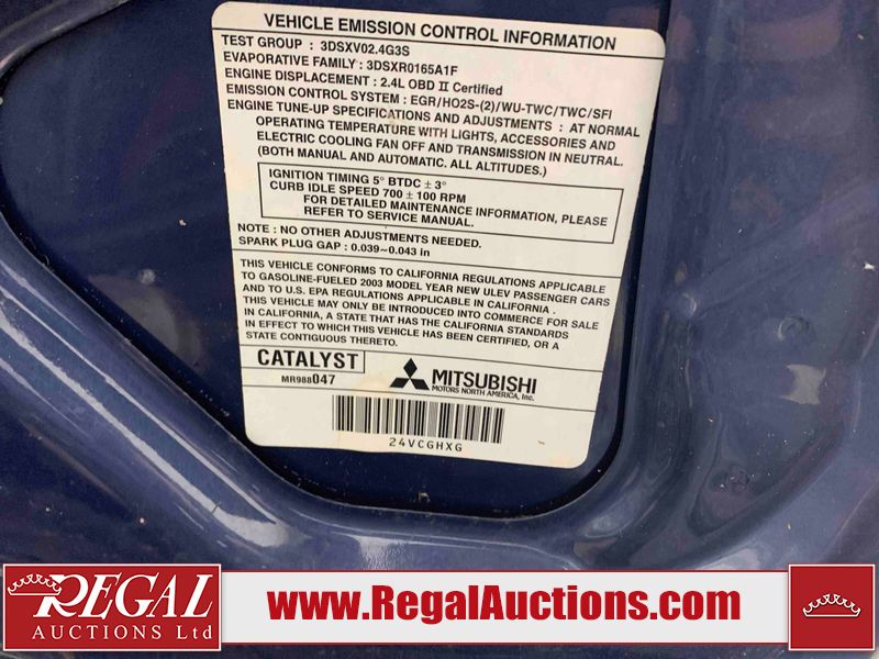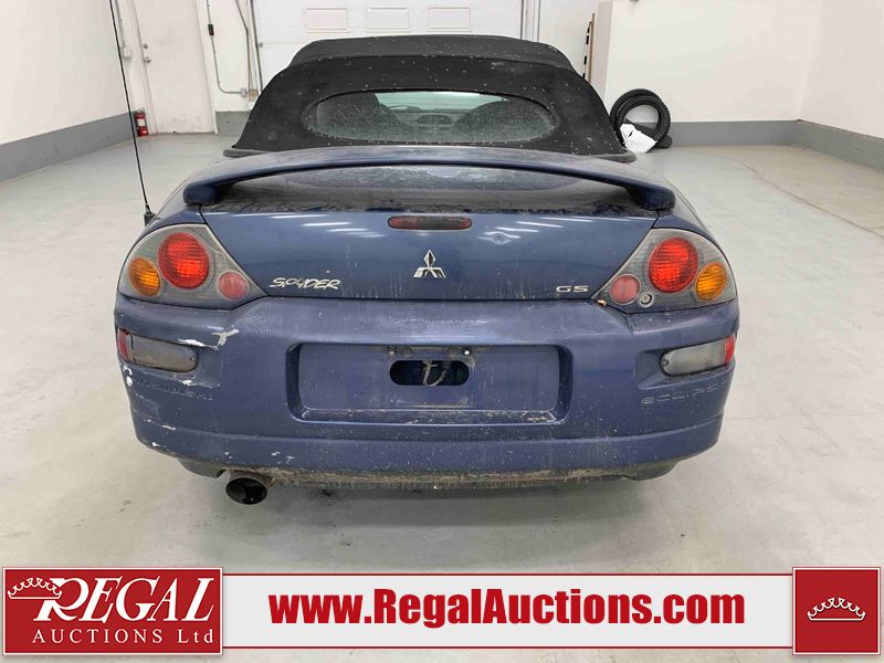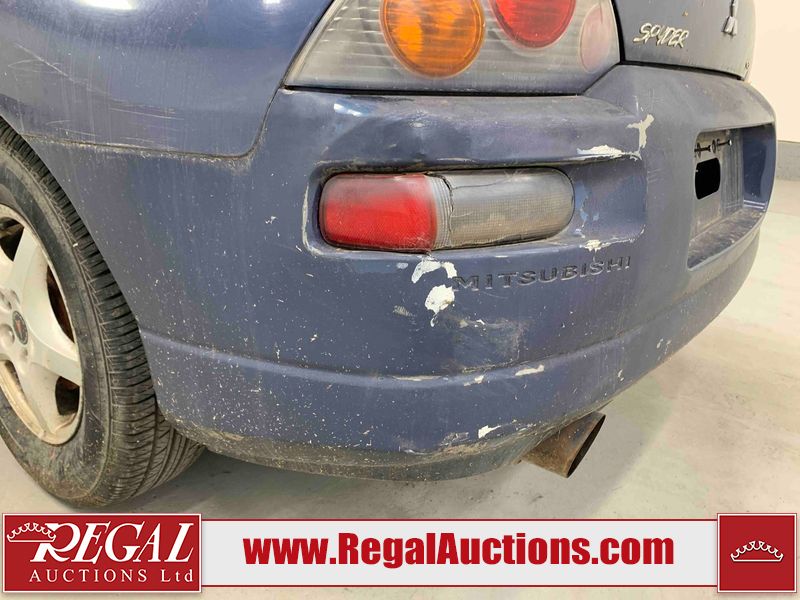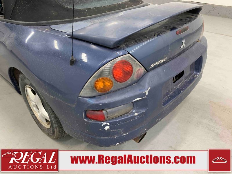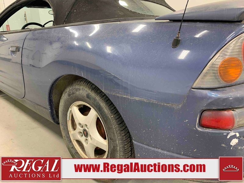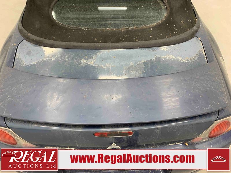 This 2003 MITSUBISHI ECLIPSE SPYDER 2D CONVERTIBLE FWD is powered by a 2.4L 4-cylinder gasoline engine and an automatic transmission. The car has seats for 4 people. The mileage is average considering the car 's age. The odometer is in miles and its reading, 97,441 miles, translates into 155,905 kilometers. The vehicle has high-value options including leather upholstery and a convertible top. The vehicle has some mechanical problems. The engine runs rough. (See Footnote 1) The body looks to be in rough condition overall. The front bumper and rear bumper are cracked. The grille is missing. There is some paint fade on the hood, trunk lid, and right front door. There is some paint peeling on the hood and trunk lid. There is some paint overspray on the left front door, left rear fender, right rear fender, and right rear door. There is conspicuous rust on the right front door and right front fender. There are chips on the front bumper, hood, roof, left front fender, left front door, left rear fender, rear bumper, trunk lid, right rear fender, right rear door, and right front door. There are scratches on the front bumper, hood, roof, left front fender, left front door, left rear fender, rear bumper, trunk lid, right rear fender, right rear door, and right front door. There is rust on the hood. There is incidental dent damage on the left front fender, left front door, left rear fender, right rear fender, and right front door. There is slight paint peeling on the rear bumper and right rear door. The headlight lenses are hazy. The fog lights are broken. The tail lights are broken. The interior looks to be in fair condition overall. The dashboard, rear seats, and doors are worn. The driver's seat and passenger seat are torn. The roofliner is dirty. The windshield is cracked. The passenger side rear tire is worn. All of the other tires have lots of tread remaining. This car is being sold by an automotive broker. The vehicle will be sold with the following declarations: Mechanical Problems (See Footnote 1) and Odometer in Miles (See Footnote 2). Footnotes: 1) We've identified some mechanical problems with the vehicle. However, the vehicle has not undergone a mechanical inspection and our findings are not to be considered a complete evaluation of the vehicle's mechanical condition. Review our Buyer Protection Policy to see how Regal Auctions protects you from undisclosed mechanical problems. 2) The vehicle's odometer reading is in miles and not kilometers. (1 Mile = 1.6 Kilometers). Regal Auctions Ltd. makes no guarantee or warranty, either express or implied, with respect to the data provided in this report. The information has been provided from the consignor and from sources generally believed to be reliable, however the accuracy of this information cannot be guaranteed by Regal Auctions.