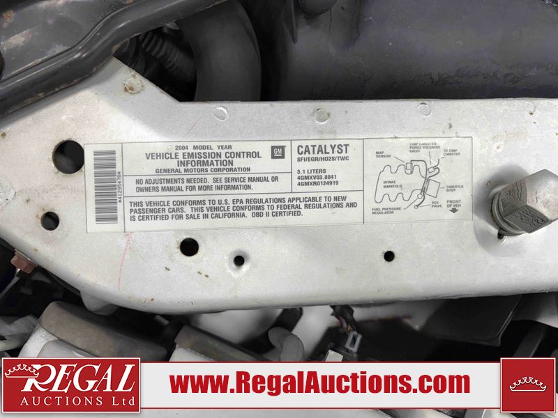 This 2004 BUICK CENTURY 4D SEDAN is powered by a 3.1 liter 6-cylinder gasoline engine and an automatic transmission. The car has seats for 6 people. The car has low mileage for its age. The Maintenance light is on. The body looks to be in fair condition overall. There is some paint peeling on the right rear fender. There are incidental scratches on the front bumper, left front fender, and right front door. There is minimal rust on the left front fender and right rear fender. There are chips in many areas around the body. There are scratches in many areas around the body. There is dent damage on the right rear door. The interior looks to be in good condition overall. The windshield looks to be in good condition. The front tires are nearly bald and should be replaced. The rear tires have lots of tread. This car is being sold by an automotive broker. The vehicle will be sold with the following declarations: Claims Total $1000 - $2999 (See Footnote 1) and Out of Province - BC (See Footnote 2). Footnotes: 1) The vehicle's total recorded insurance claims history is between $1,000 - $2,999. This is the amount of money that was paid out by an insurance company for repairs to cover claims against the vehicle's insurance policy. This information is provided by CarFax. 2) The vehicle's last registered jurisdiction is British Columbia. The purchaser must have the vehicle undergo and pass an Out of Province inspection before it can be registered in Alberta. Regal Auctions Ltd. makes no guarantee or warranty, either express or implied, with respect to the data provided in this report. The information has been provided from the consignor and from sources generally believed to be reliable, however the accuracy of this information cannot be guaranteed by Regal Auctions.