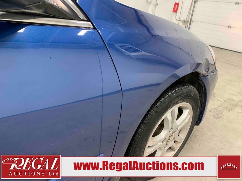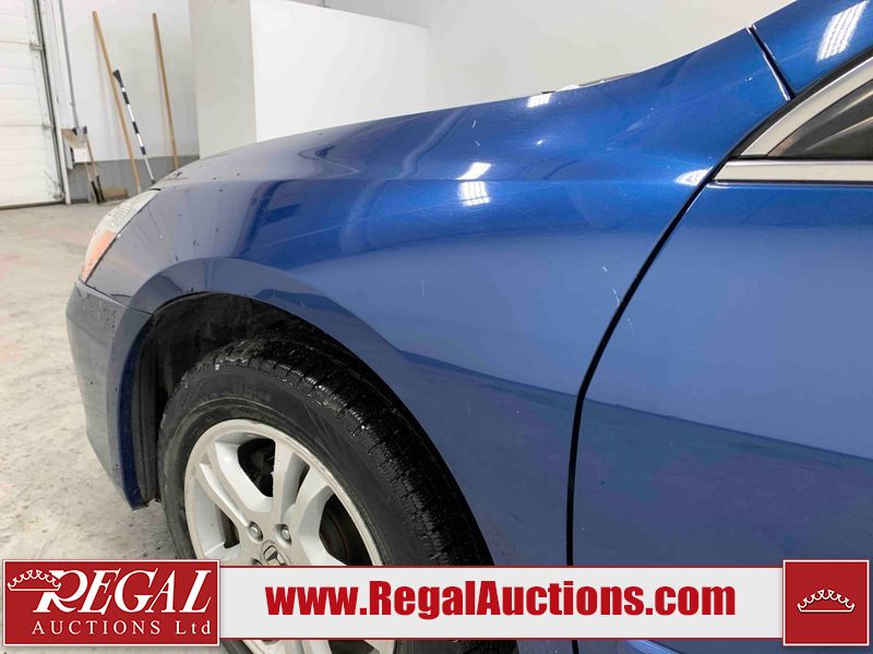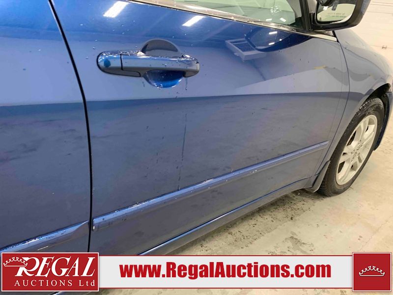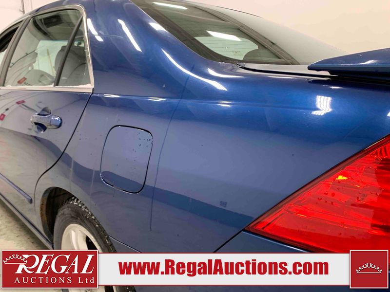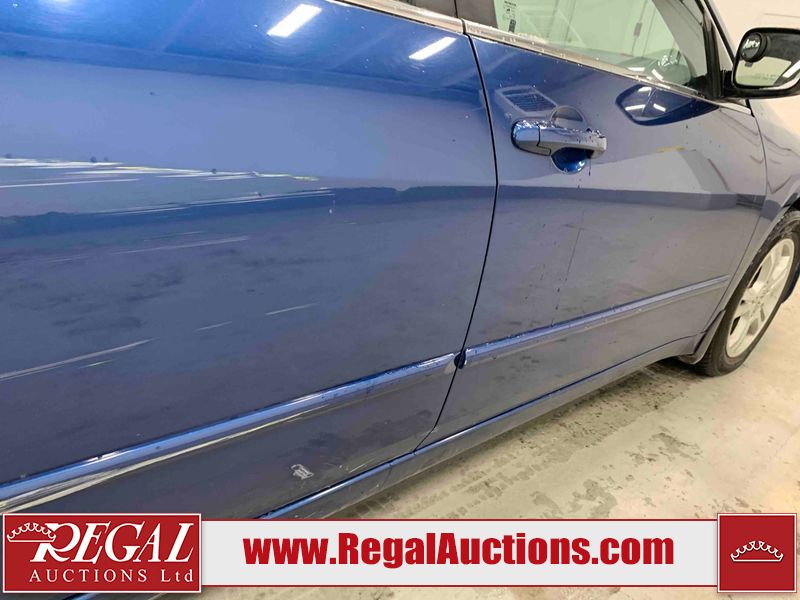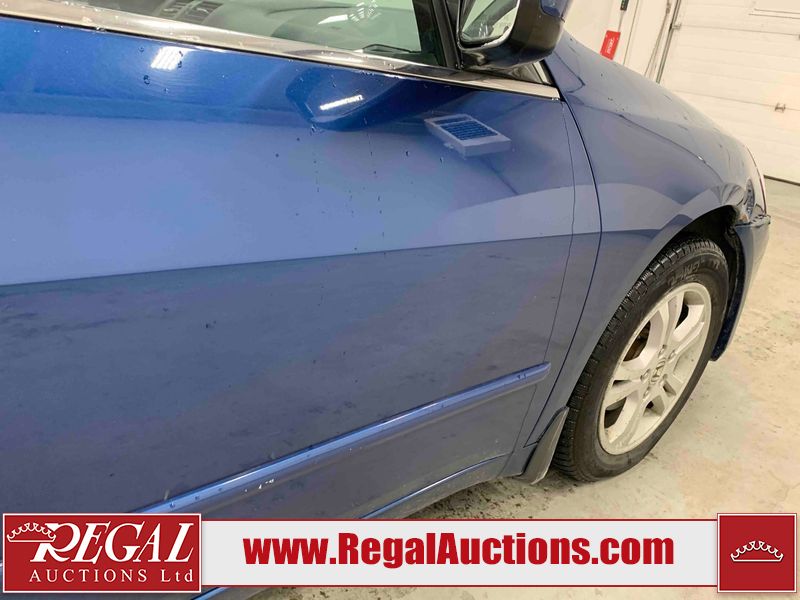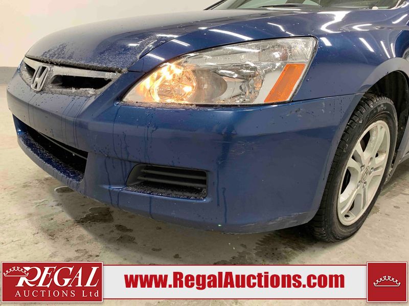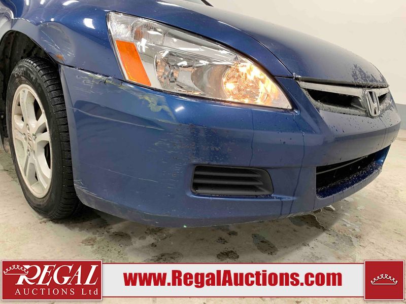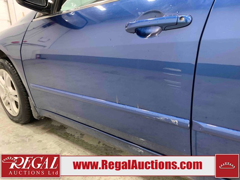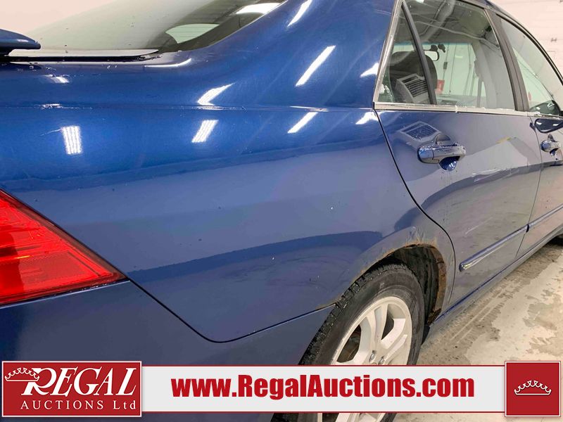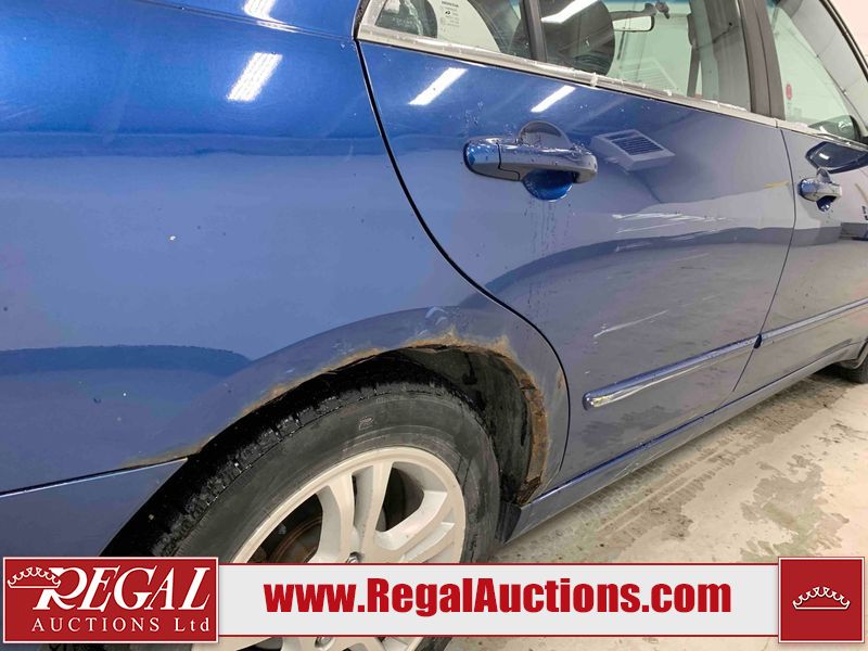 This 2006 HONDA ACCORD 4D SEDAN is powered by a 2.4L 4 cylinder gasoline engine and an automatic transmission. The car has seats for 5 people. The car has high mileage for its age. The vehicle has high value options including a sunroof, leather upholstery, power seats, and heated seats. The body looks to be in rough condition overall. The hood is cracked. There are noteworthy scratches on the hood and right rear door. There are chips on the front bumper, hood, left front fender, left front door, left rear door, left rear fender, rear bumper, trunk lid, right rear fender, right rear door, right front door, and right front fender. There are minor scratches on the front bumper, left front fender, left front door, left rear door, left rear fender, rear bumper, and right front fender. There is minor rust on the roof, right rear fender, left rear fender, and right front fender. There is slight paint peeling on the roof. There is dent damage on the left front fender, left rear fender, and right front fender. There are very minor chips in a few areas around the body. There are very minor scratches in many areas around the body. The interior looks to be in good condition overall. The windshield looks to be in good condition. All of the tires have lots of tread remaining. This car is being sold by an automotive broker. The vehicle will be sold with the following declarations: Claims Total $3000 - $4999 (See Footnote 1). Footnotes: 1) The vehicle's total recorded insurance claims history is between $3,000 - $4,999. This is the amount of money that was paid out by an insurance company for repairs to cover claims against the vehicle's insurance policy. This information is provided by CarFax. Regal Auctions Ltd. makes no guarantee or warranty, either express or implied, with respect to the data provided in this report. The information has been provided from the consignor and from sources generally believed to be reliable, however the accuracy of this information cannot be guaranteed by Regal Auctions.