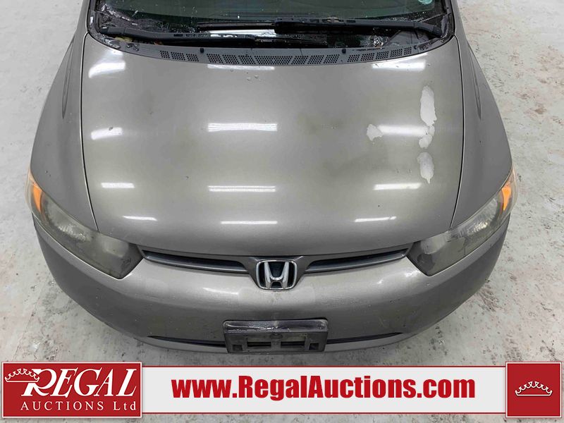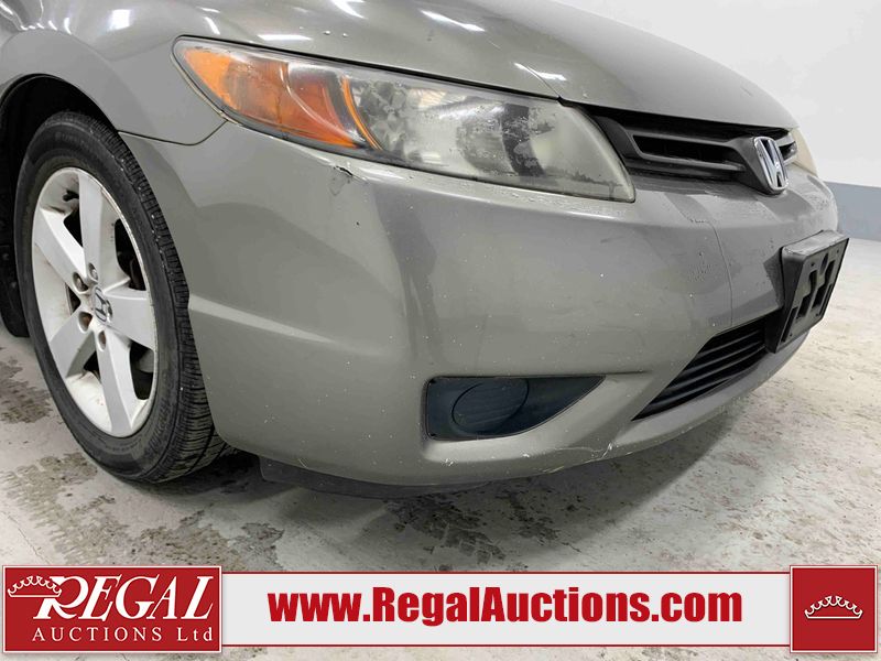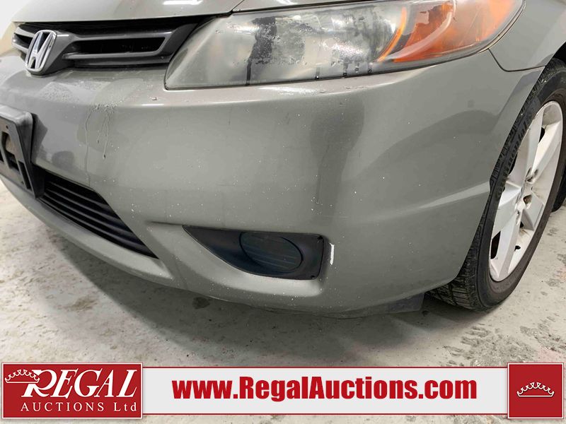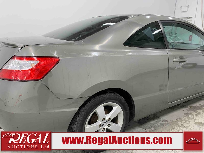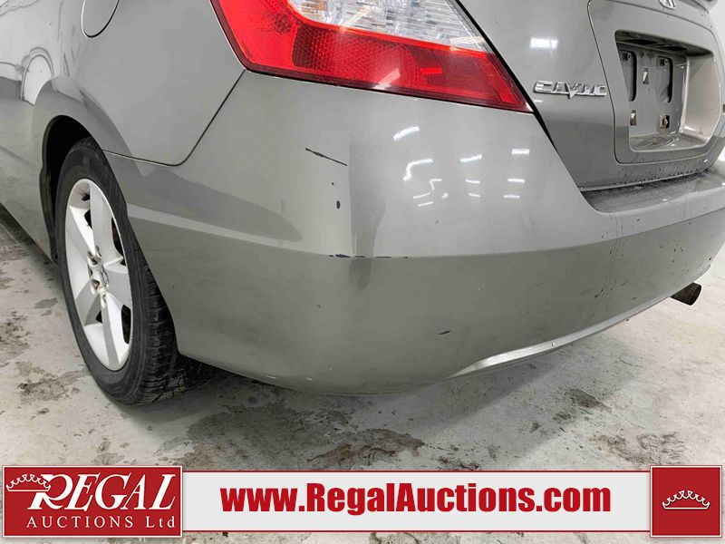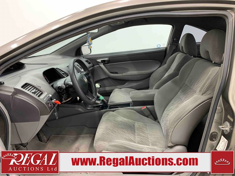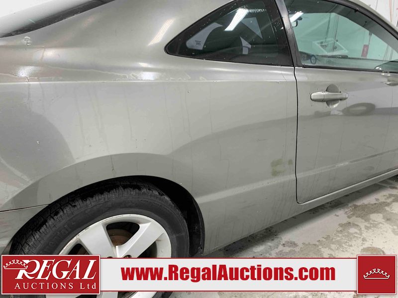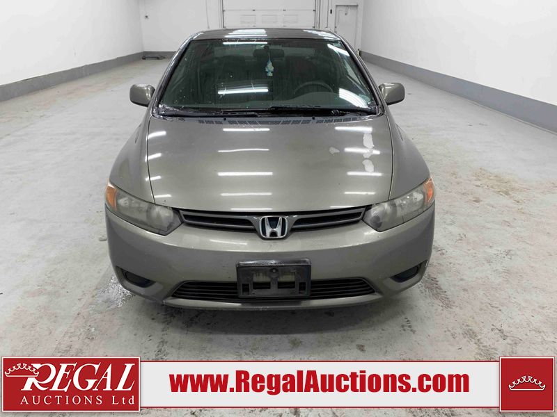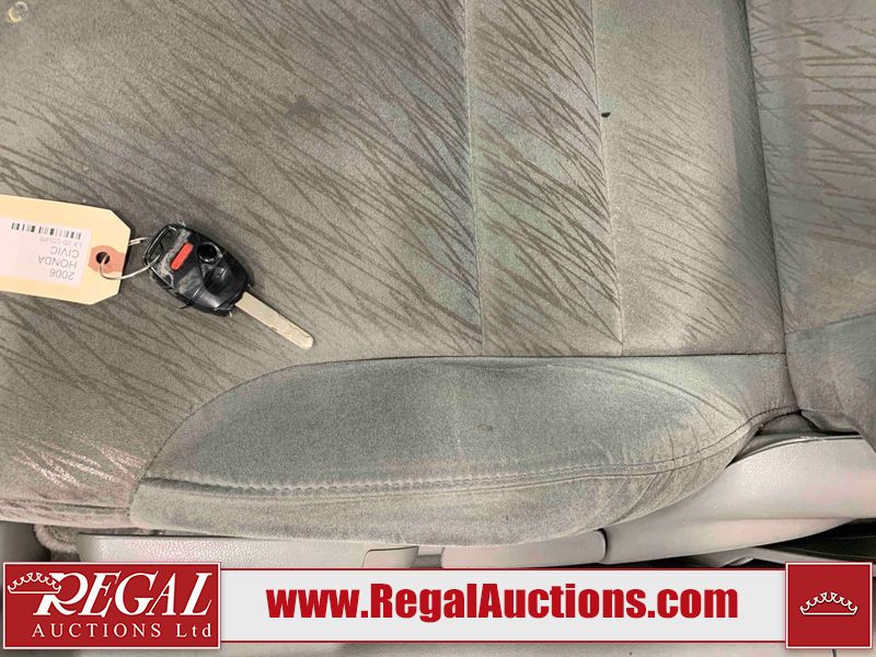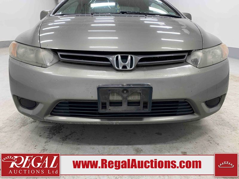 This 2006 HONDA CIVIC LX 2D COUPE is powered by a 1.8L 4-cylinder gasoline engine and a 5-speed manual transmission. The car has seats for 5 people. The car has high mileage for its age. The body looks to be in fair condition overall. There is noteworthy paint peeling on the hood. There are chips on the front bumper and rear bumper. There are slight scratches on the front bumper, left front fender, left front door, left rear fender, rear bumper, and right rear fender. There are very minor chips in many areas around the body. There are very minor scratches in many areas around the body. The interior looks to be in fair condition overall. There are some cigarette burns on the driver's seat. There are conspicuous stains on the passenger seat. The doors are worn. The windshield looks to be in good condition. The rear tires are worn. The front tires have lots of tread remaining. This car is being sold by an automotive broker. The vehicle will be sold with the following declarations: Out of Province - BC (See Footnote 1) and Out of Province - AB OVERRIDE (See Footnote 2). Footnotes: 1) The vehicle's last registered jurisdiction is British Columbia. The purchaser must have the vehicle undergo and pass an Out of Province inspection before it can be registered in Alberta. 2) Out of province inspection for registering the vehicle in Alberta has been completed. Regal Auctions Ltd. makes no guarantee or warranty, either express or implied, with respect to the data provided in this report. The information has been provided from the consignor and from sources generally believed to be reliable, however the accuracy of this information cannot be guaranteed by Regal Auctions.