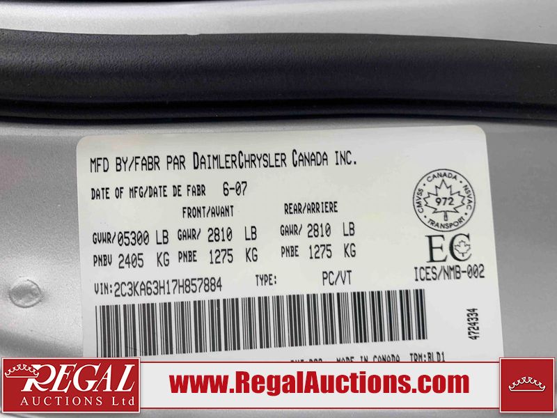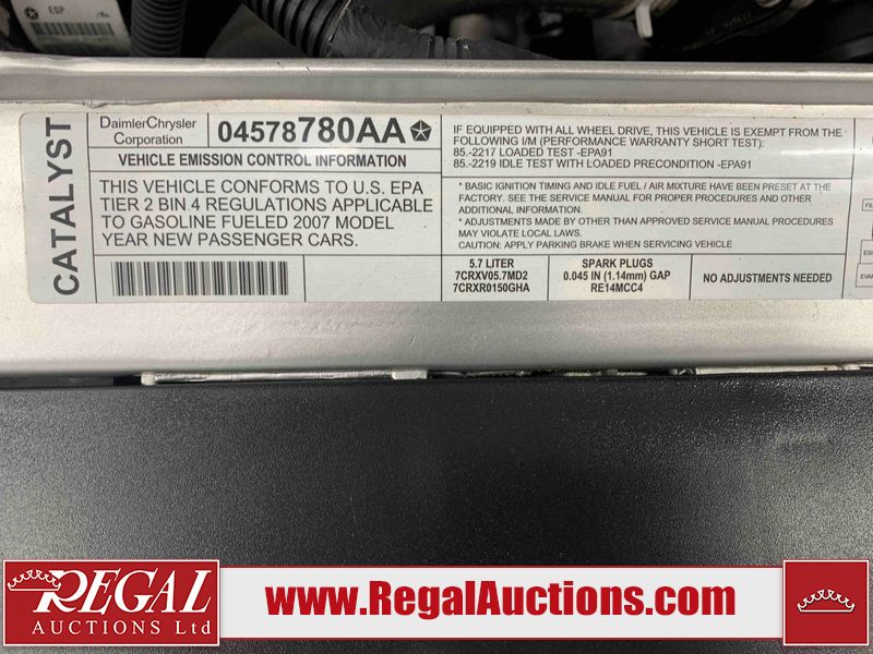 This 2007 CHRYSLER 300 C 4D SEDAN RWD is powered by a 5.7L V8 gasoline engine and an automatic transmission. The car has seats for 5 people. The car has low mileage for its age. C is a very popular trim level. The vehicle has high-value options including a sunroof, leather upholstery, power seats, heated seats, navigation, and a backup camera. The body looks to be in rough condition overall. The rear bumper is cracked. There are incidental scratches on the front bumper, left front fender, left front door, rear bumper, and right front fender. There are minor chips on the front bumper. There is dent damage on the left front fender and right front fender. There is rust on the right front fender. There are very minor chips in many areas around the body. There are very minor scratches in many areas around the body. The interior looks to be in good condition overall. The driver's seat is worn. The windshield is chipped. All of the tires have lots of tread remaining. This car is being sold by an automotive broker. Regal Auctions Ltd. makes no guarantee or warranty, either express or implied, with respect to the data provided in this report. The information has been provided from the consignor and from sources generally believed to be reliable, however the accuracy of this information cannot be guaranteed by Regal Auctions.