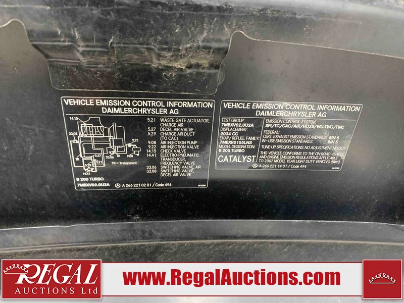 This 2007 MERCEDES-BENZ B200 4D HATCHBACK is powered by a 2.0L 4-cylinder gasoline engine and an automatic transmission. The car has seats for 5 people. The car has low mileage for its age. The vehicle has high-value options including a sunroof and heated seats. The ABS light is on. The body looks to be in rough condition overall. There is severe hail on the hood and roof. There are incidental chips on the front bumper. There are slight scratches on the front bumper, rear bumper and right rear fender. There is minimal hail on the left front fender, left front door, left rear door, left rear fender, right rear fender, right rear door, right front door, and right front fender. There is dent damage on the trunk lid, right rear fender, and right front door. The right rear door has parts missing. There are very minor chips in many areas around the body. There are very minor scratches in many areas around the body. The interior looks to be in fair condition overall. There are obvious stains on the driver's seat, passenger seat, and rear seats. The windshield looks to be in good condition. All of the tires have lots of tread remaining. This car is being sold by an automotive broker. The vehicle will be sold with the following declarations: Claims Total $15,000 - $19,999 (See Footnote 1) and Hail Damage (See Footnote 2). Footnotes: 1) The vehicle's total recorded insurance claims history is between $15,000 - $19,999. This is the amount of money that was paid out by an insurance company for repairs to cover claims against the vehicle's insurance policy. This information is provided by CarFax. 2) This vehicle shows signs of damage from a hail storm. Hail damage is not always clearly visible in photographs. Regal Auctions Ltd. makes no guarantee or warranty, either express or implied, with respect to the data provided in this report. The information has been provided from the consignor and from sources generally believed to be reliable, however the accuracy of this information cannot be guaranteed by Regal Auctions.