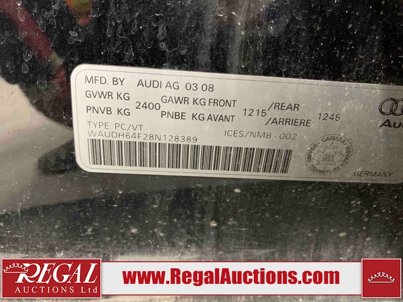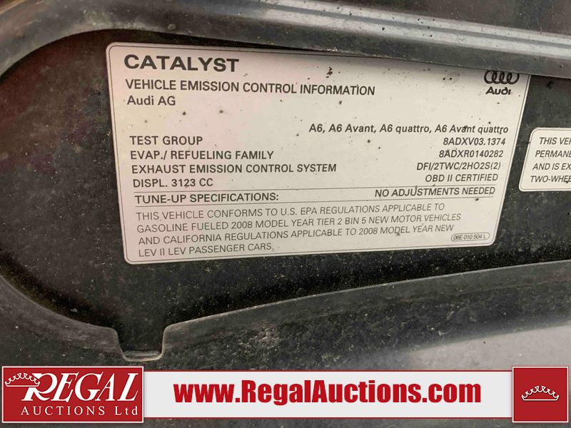This 2008 AUDI A6 4D SEDAN AWD is powered by a 3.2 liter 6-cylinder gasoline engine and an automatic transmission. It is equipped with all-wheel drive. The car has seats for 5 people. The mileage is average considering the car's age. The vehicle has high-value options, including a sunroof, leather upholstery, power seats, heated seats, navigation, and a backup camera. The body looks to be in fair condition overall. There is some rust on the left rear fender and right rear fender. There are slight chips on the front bumper, hood, left front fender, and right front fender. There are scratches on the left front door, left rear door, left rear fender, rear bumper, right rear fender, and right rear door. There is rust on the left front door, left rear door, right rear door, and right front door. There are scratches on the right front door. The fog lights are broken. The interior looks to be in good condition overall. The windshield looks to be in good condition. All of the tires have lots of tread remaining. This car is being sold by an automotive broker. The vehicle will be sold with the following declarations: Claims Total $1000 - $2999 (See Footnote 1). Footnotes: 1) The vehicle's total recorded insurance claims history is between $1,000 - $2,999. This is the amount of money that was paid out by an insurance company for repairs to cover claims against the vehicle's insurance policy. This information is provided by CarFax. Regal Auctions Ltd. makes no guarantee or warranty, either express or implied, with respect to the data provided in this report. The information has been provided from the consignor and from sources generally believed to be reliable, however the accuracy of this information cannot be guaranteed by Regal Auctions.