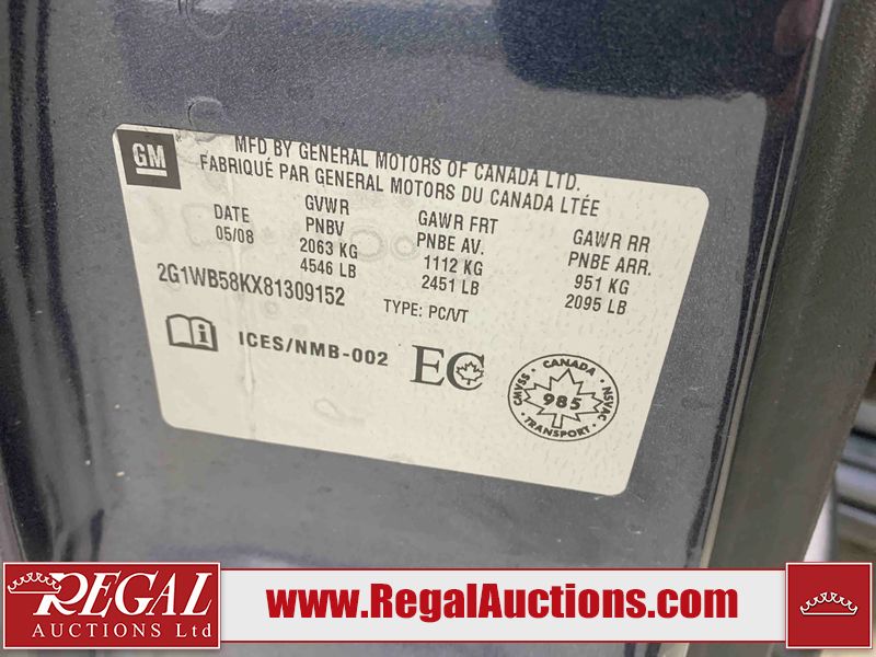 This 2008 CHEVROLET IMPALA LS 4D SEDAN is powered by a 3.5L V6 gasoline engine and an automatic transmission. The car has seats for 5 people. The mileage is average considering the car's age. The Tire Pressure light is on. The body looks to be in fair condition overall. There are minimal scratches on the front bumper, hood, left front door, left rear door, left rear fender, rear bumper, rear door, right rear fender, right rear door, right front door, and right front fender. There are incidental chips on the left rear fender and rear bumper. There is slight dent damage on the left rear fender and right rear fender. There are very minor chips in many areas around the body. There are very minor scratches in a few areas around the body. The interior looks to be in good condition overall. The windshield looks to be in good condition. All of the tires have lots of tread remaining. This car is being sold by an automotive broker. The vehicle will be sold with the following declarations: Out of Province - BC (See Footnote 1). (See Footnote 2) and Out of Province - AB OVERRIDE (See Footnote 3). Footnotes: 1) The vehicle's last registered jurisdiction is British Columbia. The purchaser must have the vehicle undergo and pass an Out of Province inspection before it can be registered in Alberta. 3) Out of province inspection for registering the vehicle in Alberta has been completed. Regal Auctions Ltd. makes no guarantee or warranty, either express or implied, with respect to the data provided in this report. The information has been provided from the consignor and from sources generally believed to be reliable, however the accuracy of this information cannot be guaranteed by Regal Auctions.