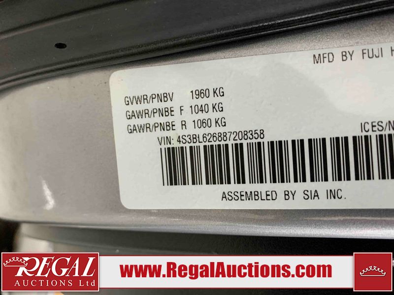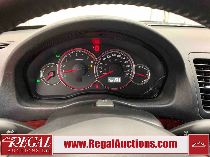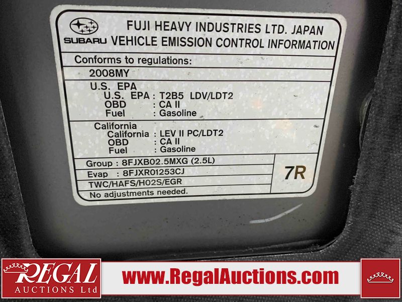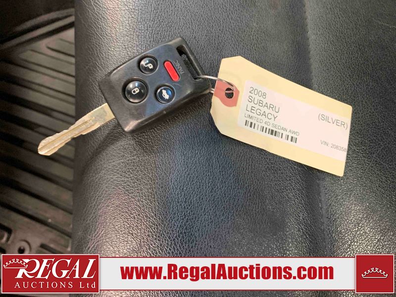 This 2008 SUBARU LEGACY LIMITED 4D SEDAN AWD is powered by a 2.5L 4-cylinder gasoline engine and an automatic transmission. It is equipped with all-wheel drive. The car has seats for 5 people. The car has low mileage for its age. LIMITED is a very popular trim level. The vehicle has high-value options including a sunroof, leather upholstery, power seats, and heated seats. The body looks to be in fair condition overall. There are noteworthy scratches on the left front fender and rear bumper. There are chips on the front bumper and hood. There is incidental dent damage on the left front fender and rear bumper. There are minimal scratches on the left front door and left rear fender. There are very minor scratches in many areas around the body. There are very minor chips in a few areas around the body. There is very minor dent damage on the left rear fender. The interior looks to be in good condition overall. The windshield looks to be in good condition. All of the tires have lots of tread remaining. This car is being sold by an automotive broker. The vehicle will be sold with the following declarations: Out of Province - BC (See Footnote 1). Footnotes: 1) The vehicle's last registered jurisdiction is British Columbia. The purchaser must have the vehicle undergo and pass an Out of Province inspection before it can be registered in Alberta. Regal Auctions Ltd. makes no guarantee or warranty, either express or implied, with respect to the data provided in this report. The information has been provided from the consignor and from sources generally believed to be reliable, however the accuracy of this information cannot be guaranteed by Regal Auctions.