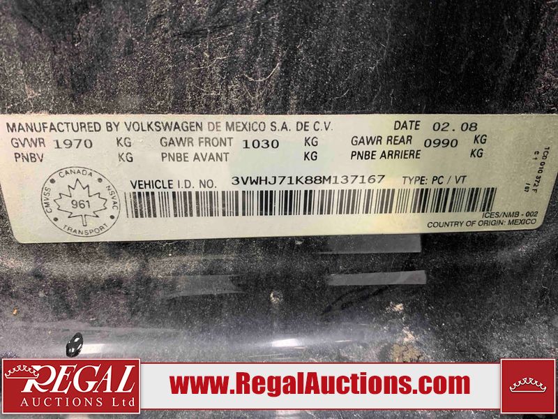This 2008 VOLKSWAGON JETTA 4D SEDAN is powered by a turbocharged 2.0L 4-cylinder gasoline engine and a 6 speed manual transmission. The car has seats for 5 people. The car has low mileage for its age. The vehicle has high value options including a sunroof and heated seats. The body looks to be in rough condition overall. There is severe hail on the roof. The fascia is broken on the front bumper. There is noteworthy hail on the hood and trunk lid. There are some scratches on the rear bumper. There is rust on the left rocker panel and right rocker panels. There are chips on the front bumper, grille, hood, left front fender, and right front fender. There is rust on the hood and right rear fender. There are scratches on the left front door, left rear door, left rear fender, right rear fender, right rear door, and right front door. There is slight dent damage on the rear bumper. There are very minor scratches on the right front fender. The interior looks to be in good condition overall. There are minimal stained on the driver's seat. The windshield looks to be in good condition. All of the tires have lots of tread remaining. This car is being sold by a franchise dealership. The vehicle will be sold with the following declarations: Dealership Trade-In (See Footnote 1), Frame Damage (See Footnote 2), and Hail Damage (See Footnote 3). Footnotes: 1) This vehicle is being sold on behalf of a franchise dealership. Franchise Dealerships are automotive sales companies who are directly connected to an automotive manufacturer like Ford, Tesla, Honda, BMW, or similar. 2) This vehicle's frame has been damaged and will require repair. 3) This vehicle shows signs of damage from a hail storm. Hail damage is not always clearly visible in photographs. Regal Auctions Ltd. makes no guarantee or warranty, either express or implied, with respect to the data provided in this report. The information has been provided from the consignor and from sources generally believed to be reliable, however the accuracy of this information cannot be guaranteed by Regal Auctions.