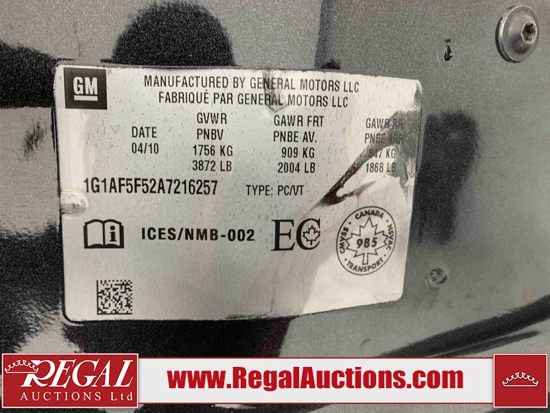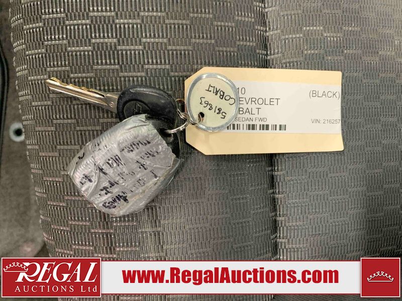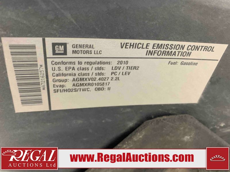 This 2010 CHEVROLET COBALT LT 4D SEDAN FWD is powered by a 2.2L 4-cylinder gasoline engine and an automatic transmission. The car has seats for 5 people. The car has low mileage for its age. The vehicle has high-value options including a sunroof. The body looks to be in rough condition overall. There is pronounced hail on the hood and roof. There is some rust on the left rear fender. There are minimal chips on the front bumper, hood, left front fender, right rear door, and right front fender. There are minor scratches on the roof, left front fender, left front door, left rear door, left rear fender, rear bumper, right rear fender, right rear door, and right front door. There is minimal hail on the trunk lid. There are very minor chips in many areas around the body. There are very minor scratches on the right front fender. The interior looks to be in good condition overall. There are minimal stains on the passenger seat. The windshield looks to be in good condition. All of the tires have lots of tread remaining. This car is being sold by a private individual. The vehicle will be sold with the following declarations: Hail Damage (See Footnote 1), Out of Province - ON (See Footnote 2), and Out of Province - AB OVERRIDE (See Footnote 3). Footnotes: 1) This vehicle shows signs of damage from a hail storm. Hail damage is not always clearly visible in photographs. 2) The vehicle's last registered jurisdiction is Ontario. The purchaser must have the vehicle undergo and pass an Out of Province inspection before it can be registered in Alberta. 3) Out of province inspection for registering the vehicle in Alberta has been completed. Regal Auctions Ltd. makes no guarantee or warranty, either express or implied, with respect to the data provided in this report. The information has been provided from the consignor and from sources generally believed to be reliable, however the accuracy of this information cannot be guaranteed by Regal Auctions.