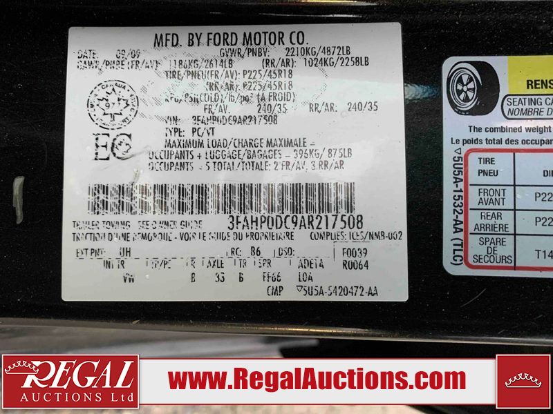 This 2010 FORD FUSION SPORT 4D SEDAN AWD is powered by a 3.5L V6 gasoline engine and an automatic transmission. It is equipped with all-wheel drive. The car has seats for 5 people. The car has high mileage for its age. The vehicle has high-value options including a sunroof, leather upholstery, power seats, heated seats, and a backup camera. The vehicle has some mechanical problems. The vehicle is physically not drivable. It will have to be towed. The exhaust system has been cut. The exhaust is noisy. The all-wheel drive system does not work. (See Footnote 1) The body looks to be in fair condition overall. The front bumper is broken. The rear bumper is cracked. There are minimal chips on the front bumper, hood, left front fender, and right front fender. There are slight scratches on the left front door, left rear door, right rear fender, right rear door, and right front door. There is minor dent damage on the right front fender. There are very minor chips in a few areas around the body. There are very minor scratches in a few areas around the body. The interior looks to be in good condition overall. The windshield is cracked. All of the tires have lots of tread remaining. This car is being sold by a franchise dealership. The vehicle will be sold with the following declarations: Dealership Trade-In (See Footnote 2). Footnotes: 1) We've identified some mechanical problems with the vehicle. However, the vehicle has not undergone a mechanical inspection and our findings are not to be considered a complete evaluation of the vehicle's mechanical condition. Review our Buyer Protection Policy to see how Regal Auctions protects you from undisclosed mechanical problems. 2) This vehicle is being sold on behalf of a franchise dealership. Franchise Dealerships are automotive sales companies who are directly connected to an automotive manufacturer like Ford, Tesla, Honda, BMW, or similar. Regal Auctions Ltd. makes no guarantee or warranty, either express or implied, with respect to the data provided in this report. The information has been provided from the consignor and from sources generally believed to be reliable, however the accuracy of this information cannot be guaranteed by Regal Auctions.