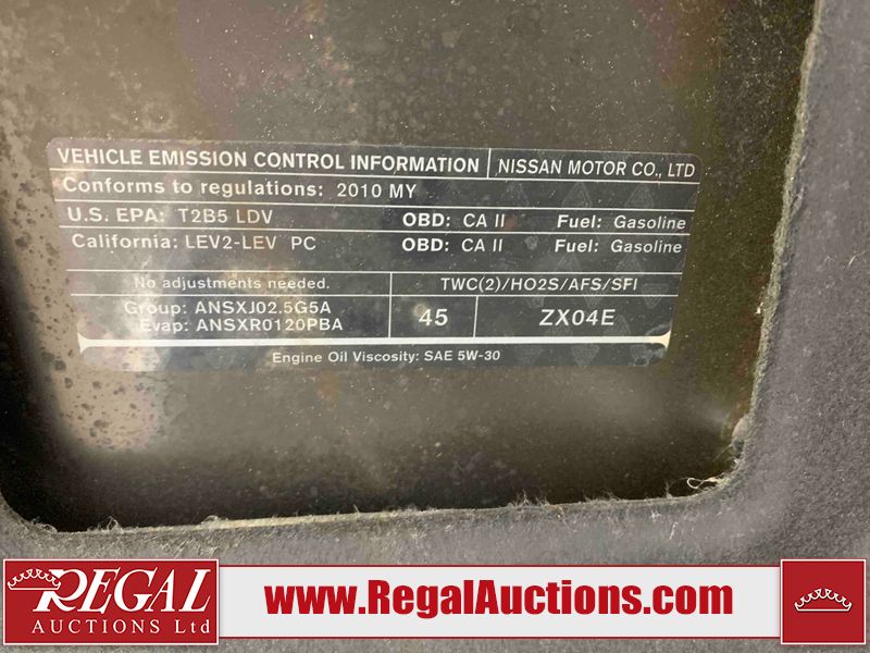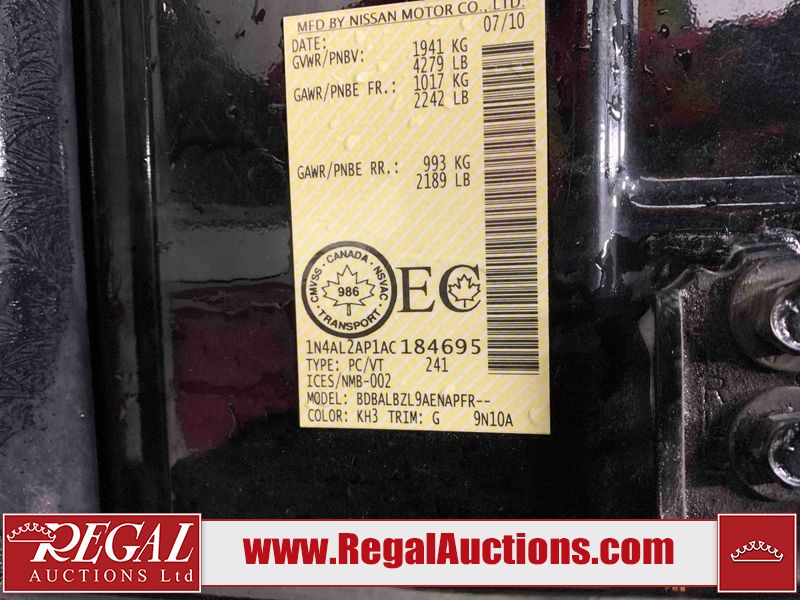 This 2010 NISSAN ALTIMA SL 4D SEDAN is powered by a 2.5 liter 4-cylinder gasoline engine and an automatic transmission. The car has seats for 5 people. The mileage is average considering the car's age. The vehicle has high-value options, including a sunroof, leather upholstery, power seats, and heated seats. The body looks to be in fair condition overall. There is moderate rust on the right rear fender. There are a fair amount of scratches on the right rear door. There are incidental chips on the front bumper, hood, and left front fender. There are scratches on the hood, left front door, left rear door, left rear fender, rear bumper, trunk lid, right rear fender, right front door, and right front fender. There is rust on the roof. There are scratches in a few areas around the body. There are chips in some areas around the body. The interior looks to be in good condition overall. The driver's seat is worn. The windshield is cracked. The front tires are nearly bald and should be replaced. The rear tires are worn. This car is being sold by an automotive broker. Regal Auctions Ltd. makes no guarantee or warranty, either express or implied, with respect to the data provided in this report. The information has been provided from the consignor and from sources generally believed to be reliable, however the accuracy of this information cannot be guaranteed by Regal Auctions.