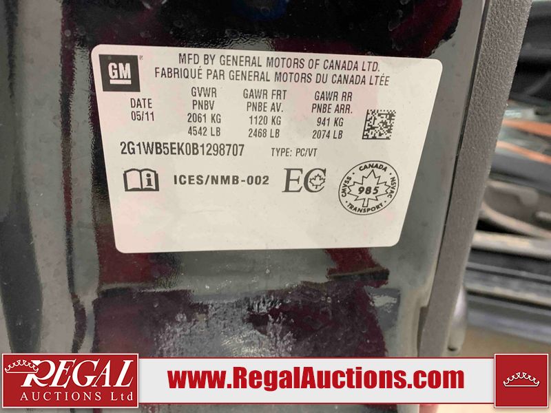 This 2011 CHEVROLET IMPALA LT 4D SEDAN is powered by a 3.5L V6 gasoline engine and an automatic transmission. The car has seats for 5 people. The car has high mileage for its age. The body looks to be in rough condition overall. The front bumper is cracked. There is a fair amount of rust on the roof. There is conspicuous paint overspray on the right rear fender. There are chips on the front bumper, hood, left front door, left rear door, rear bumper, trunk lid, and right rear door. There are slight scratches on the front bumper, left front door, left rear door, left rear fender, rear bumper, and right rear door. There is minimal paint peeling on the roof and right rear fender. There is rust on the left front door, left rear door, left rear fender, and right rear fender. There is dent damage on the left front door, left rear fender, rear bumper, right rear door, right front door, and right front fender. There is hail on the trunk lid. There are very minor chips in many areas around the body. There are very minor scratches in many areas around the body. The interior looks to be in fair condition overall. The dashboard, driver's seat, passenger seat, rear seats, and doors are dirty. The dashboard, driver's seat, passenger seat, rear seats, and doors are pet_hair. The carpet is dirty. The windshield is chipped. The tires are all worn. This car is being sold by an automotive broker. Regal Auctions Ltd. makes no guarantee or warranty, either express or implied, with respect to the data provided in this report. The information has been provided from the consignor and from sources generally believed to be reliable, however the accuracy of this information cannot be guaranteed by Regal Auctions.