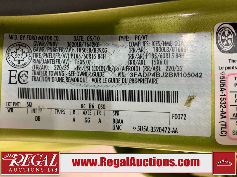This 2011 FORD FIESTA SE 4D SEDAN is powered by a 1.6 liter 4 cylinder gasoline engine and an automatic transmission. The car has seats for 5 people. The car has low mileage for its age. The body looks to be in excellent condition overall. The interior looks to be in good condition overall. The windshield looks to be in good condition. All of the tires are nearly bald and should be replaced. This car is being sold by a franchise dealership. The vehicle will be sold with the following declarations: Dealership Trade-In (See Footnote 1). Footnotes: 1) This vehicle is being sold on behalf of a franchise dealership. Franchise Dealerships are automotive sales companies who are directly connected to an automotive manufacturer like Ford, Tesla, Honda, BMW, or similar. Regal Auctions Ltd. makes no guarantee or warranty, either express or implied, with respect to the data provided in this report. The information has been provided from the consignor and from sources generally believed to be reliable, however the accuracy of this information cannot be guaranteed by Regal Auctions.