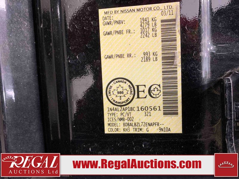 This 2011 NISSAN ALTIMA SL 4D SEDAN is powered by a 2.5 liter 4 cylinder gasoline engine and an automatic transmission. The car has seats for 5 people. The car has low mileage for its age. The vehicle has high value options including a sunroof, leather upholstery, power seats, heated seats, and a backup camera. The body looks to be in good condition overall. There are minor chips on the front bumper. There are slight scratches on the left front door, left rear door, rear bumper, right rear door, right front door, and right front fender. There are very minor chips in many areas around the body. There are very minor scratches on the right rear fender. There is very minor dent damage on the right rear fender. The interior looks to be in good condition overall. The windshield looks to be in good condition. All of the tires have lots of tread remaining. This car is being sold by an automotive broker. The vehicle will be sold with the following declarations: Out of Province - BC (See Footnote 1) and Out of Province - AB OVERRIDE (See Footnote 2). Footnotes: 1) The vehicle's last registered jurisdiction is British Columbia. The purchaser must have the vehicle undergo and pass an Out of Province inspection before it can be registered in Alberta. 2) Out of province inspection for registering the vehicle in Alberta has been completed. Regal Auctions Ltd. makes no guarantee or warranty, either express or implied, with respect to the data provided in this report. The information has been provided from the consignor and from sources generally believed to be reliable, however the accuracy of this information cannot be guaranteed by Regal Auctions.