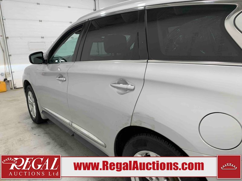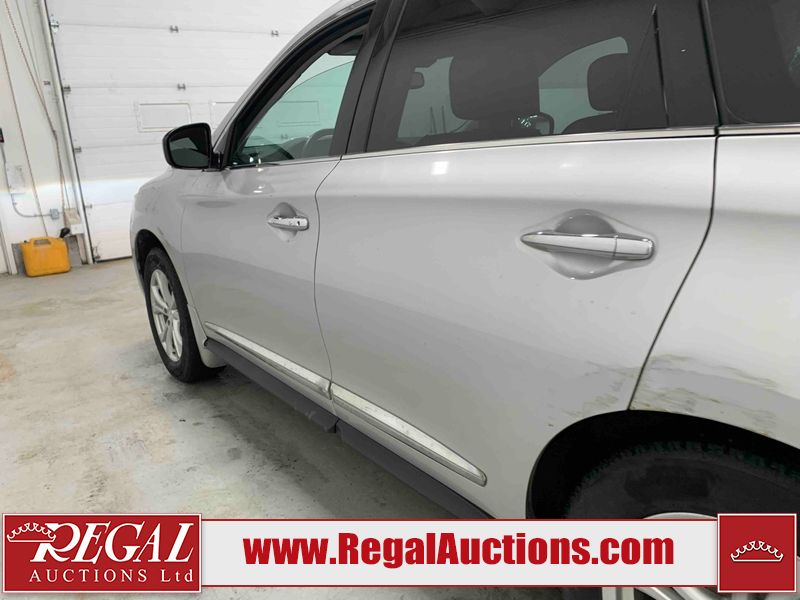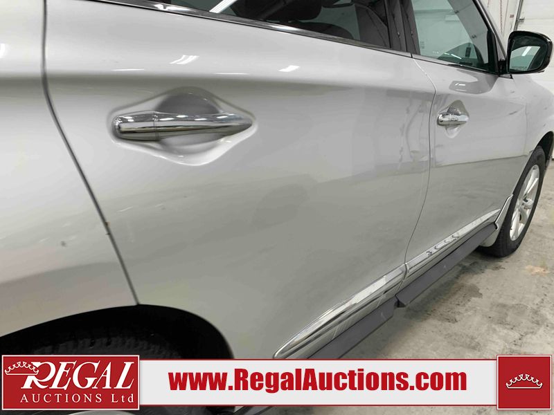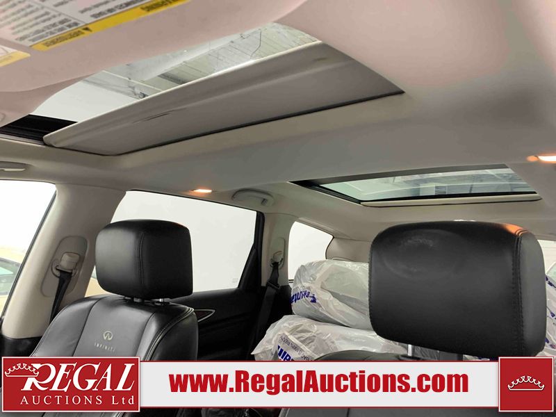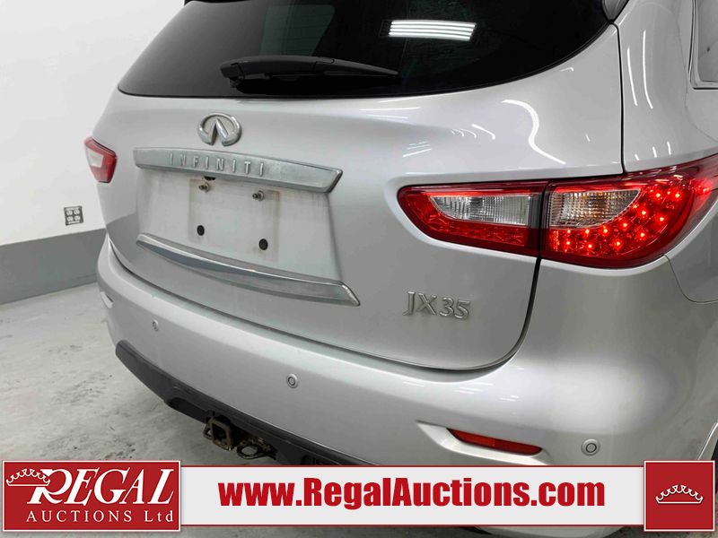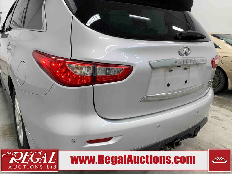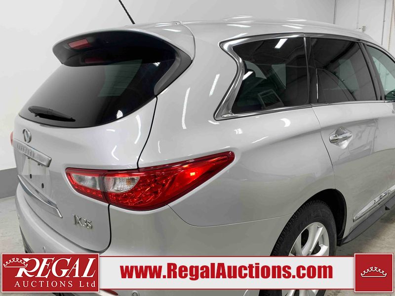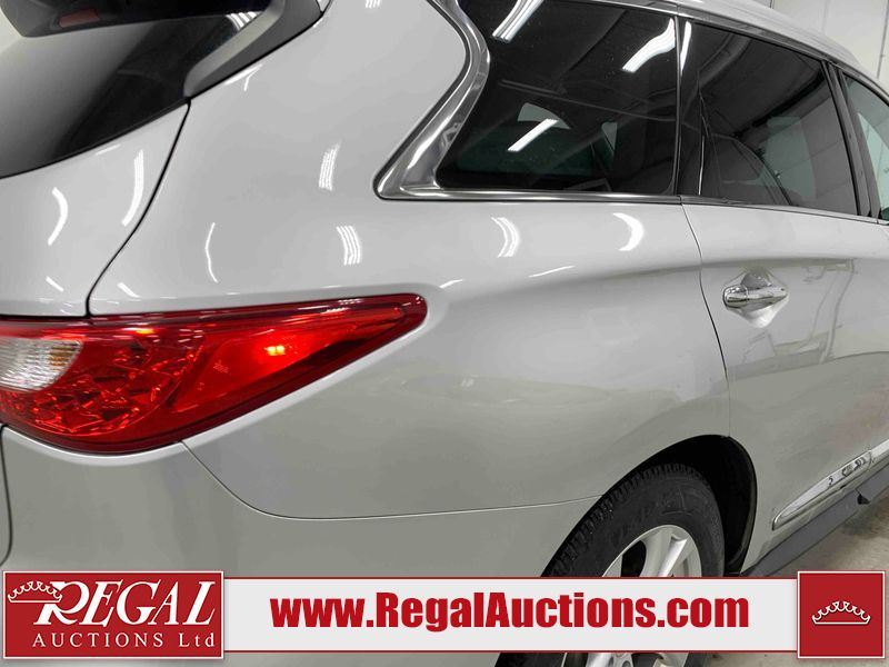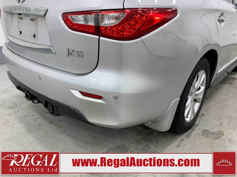 This 2013 INFINITI JX 4D SEDAN AWD is powered by a 3.5L 6 cylinder gasoline engine and an automatic transmission. It is equipped with four wheel drive. The car has seats for 5 people. The car has low mileage for its age. The vehicle has high value options including a sunroof, leather upholstery, power seats, navigation, a backup camera, and a power lift gate. The Check Engine and Stability Control lights are on. The body looks to be in rough condition overall. The front bumper is cracked. There is extensive hail on the hood, roof, left rear fender, and right rear fender. There are scratches on the front bumper, roof, left front fender, left front door, left rear door, left rear fender, rear bumper, trunk lid, right rear fender, right rear door, right front door, and right front fender. There are minor chips on the roof and rear bumper. There is rust on the roof. There is incidental dent damage on the left rear fender. There is incidental hail on the right rear door, right front door, and right front fender. There are very minor chips in many areas around the body. There are very minor scratches on the hood. The interior looks to be in good condition overall. The windshield is damaged. The front tires and the passenger side rear tire are all worn. The driver's side rear tire has lots of tread left. This car is being sold by an automotive broker. The vehicle will be sold with the following declarations: Hail Damage (See Footnote 1). Footnotes: 1) This vehicle shows signs of damage from a hail storm. Hail damage is not always clearly visible in photographs. Regal Auctions Ltd. makes no guarantee or warranty, either express or implied, with respect to the data provided in this report. The information has been provided from the consignor and from sources generally believed to be reliable, however the accuracy of this information cannot be guaranteed by Regal Auctions.