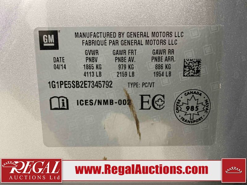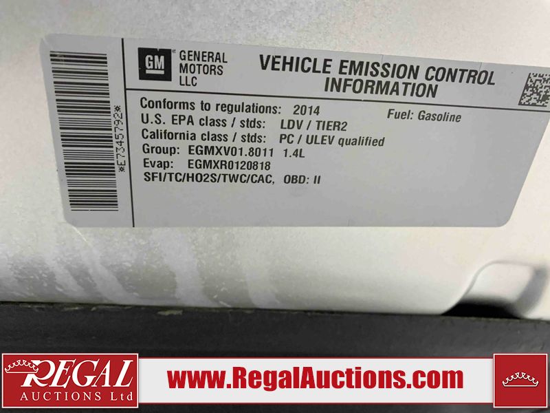 This 2014 CHEVROLET CRUZE 2LT 4D SEDAN FWD is powered by a turbocharged 1.4L 4-cylinder gasoline engine and an automatic transmission. The car has seats for 5 people. The car has low mileage for its age. The vehicle has high-value options including a sunroof, leather upholstery, power seats, and a backup camera. The body looks to be in good condition overall. The front bumper is cracked. There are chips on the front bumper and hood. There are scratches on the left front door, left rear door, and rear bumper. There are very minor chips in many areas around the body. There are very minor scratches in many areas around the body. The interior looks to be in good condition overall. The windshield looks to be in good condition. All of the tires have lots of tread remaining. This car is being sold by an automotive broker. Regal Auctions Ltd. makes no guarantee or warranty, either express or implied, with respect to the data provided in this report. The information has been provided from the consignor and from sources generally believed to be reliable, however the accuracy of this information cannot be guaranteed by Regal Auctions.